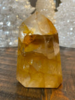 Clear quartz infused with golden-yellow to orange iron oxide veins, polished into clusters or points.