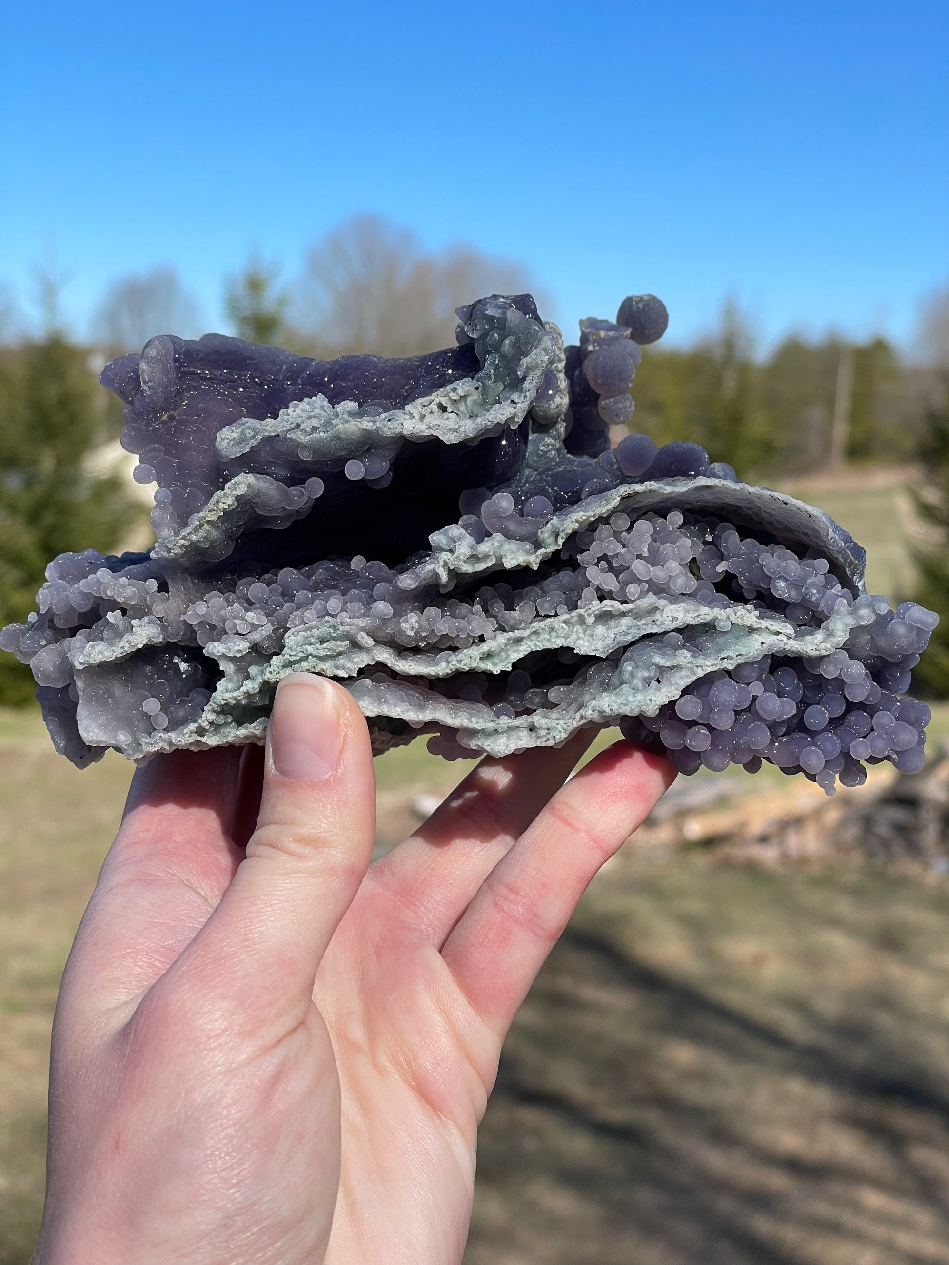 This rare crystal is sourced from Indonesia and is admired for its naturally formed clusters that resemble bunches of grapes. It is considered a high-vibration metaphysical stone for connecting with higher realms.