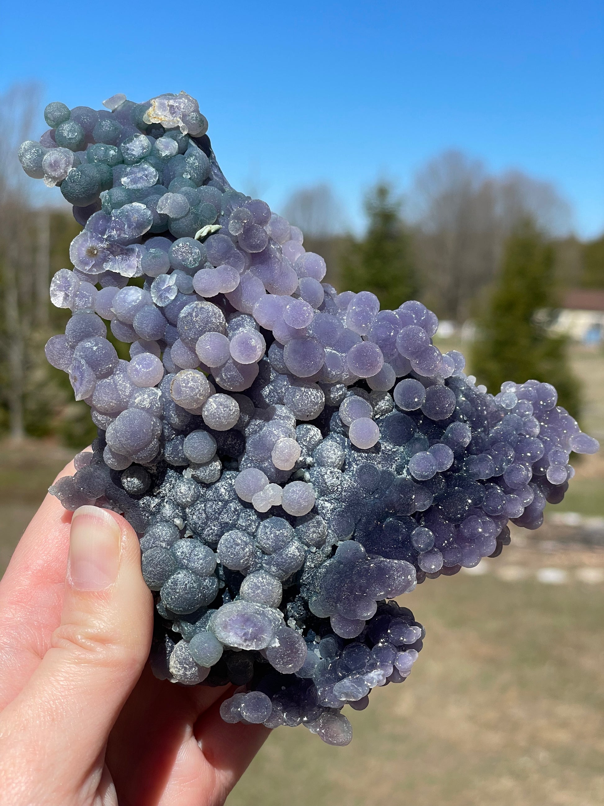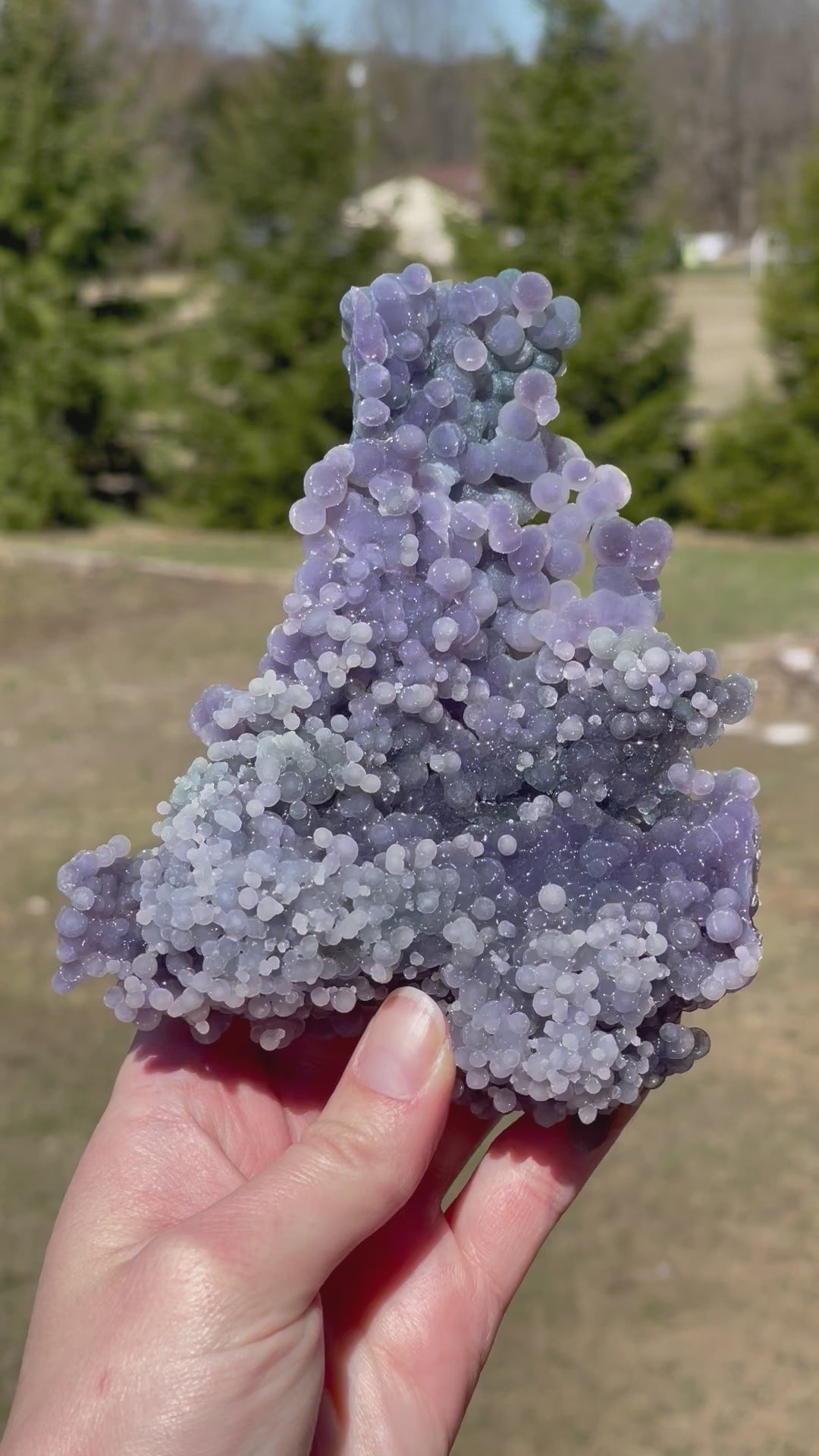 This rare crystal is sourced from Indonesia and is admired for its naturally formed clusters that resemble bunches of grapes. It is considered a high-vibration metaphysical stone for connecting with higher realms.