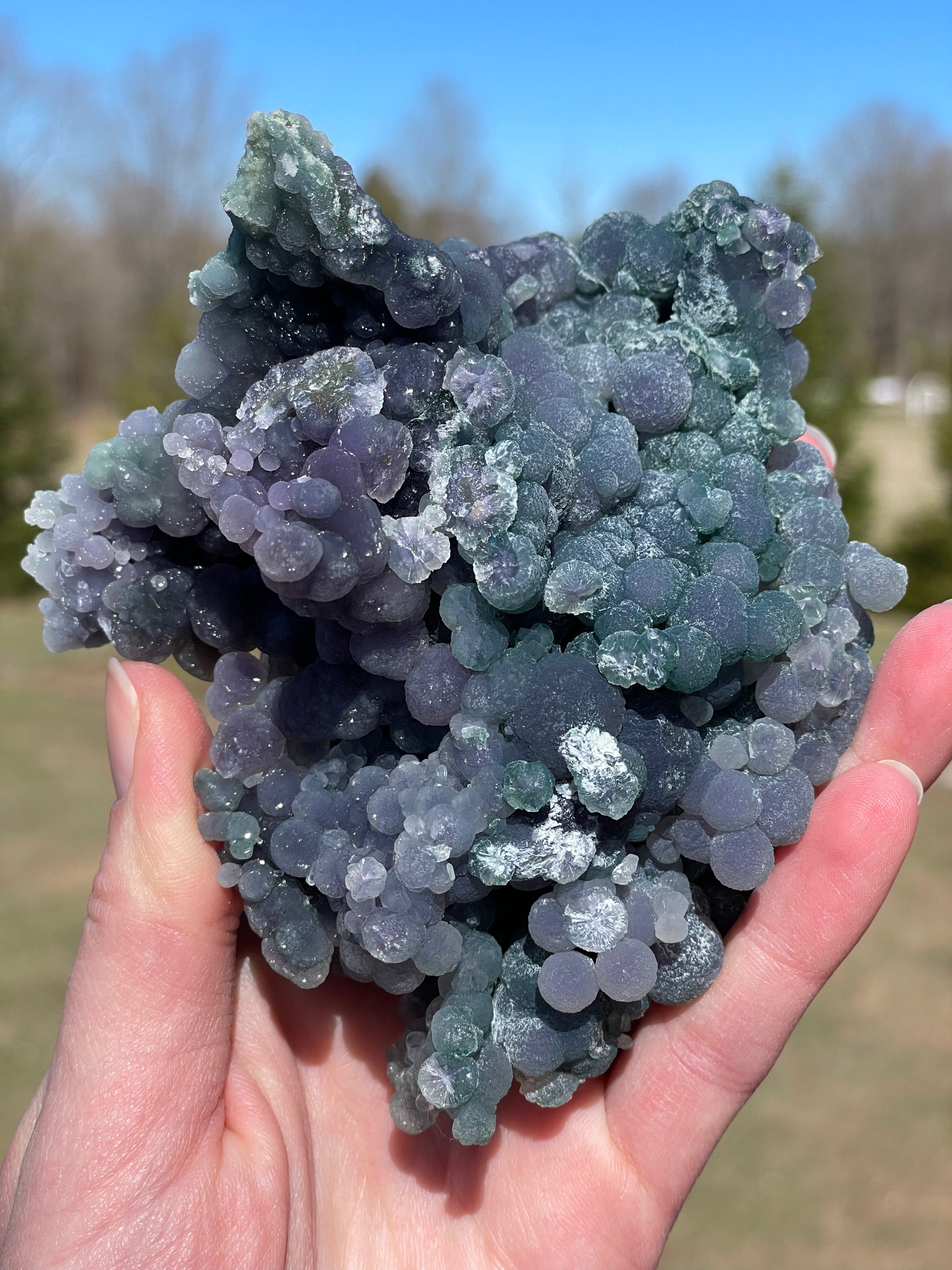 This rare crystal is sourced from Indonesia and is admired for its naturally formed clusters that resemble bunches of grapes. It is considered a high-vibration metaphysical stone for connecting with higher realms.