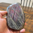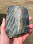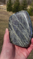 Iridescent flashes of blue, green, gold, and violet known as “labradorescence.” Polished into cabochons, towers, or palm stones.