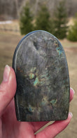 Iridescent flashes of blue, green, gold, and violet known as “labradorescence.” Polished into cabochons, towers, or palm stones.