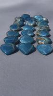 Soft layered bands of blue, teal, and white resembling waves, polished into palm stones or freeforms.