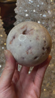 Pink Amethyst clusters and spheres display soft blush to rosy hues with sparkling crystalline surfaces. Some pieces show subtle white or clear quartz inclusions, enhancing their natural beauty.