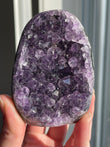 Clean gently with lukewarm water and a soft cloth. Avoid harsh sunlight, which may fade the purple tones. Cleansing methods: recharge under moonlight, place on a selenite plate, or cleanse with palo santo or sound vibration.