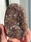 Clean gently with lukewarm water and a soft cloth. Avoid harsh sunlight, which may fade the purple tones. Cleansing methods: recharge under moonlight, place on a selenite plate, or cleanse with palo santo or sound vibration.