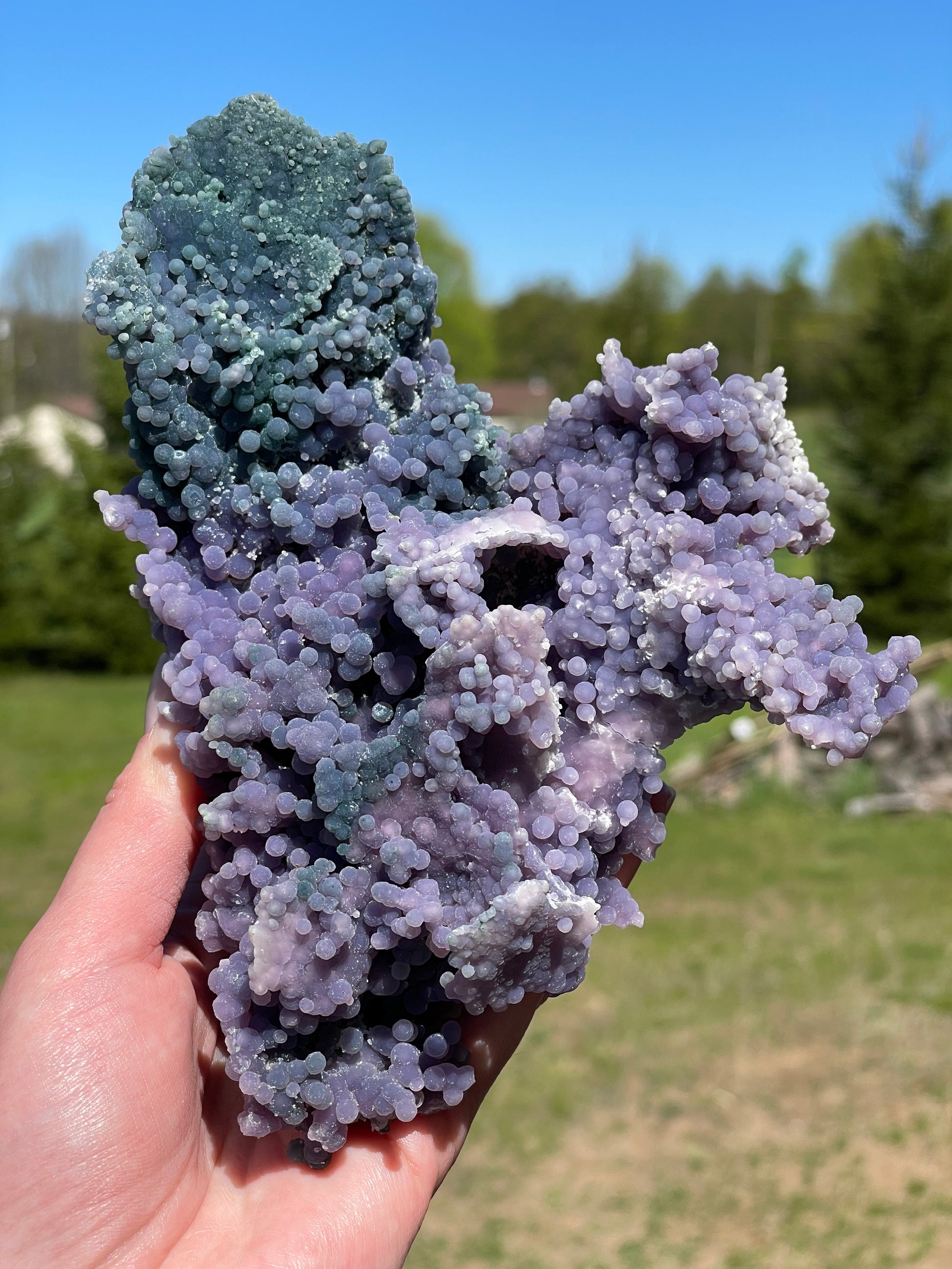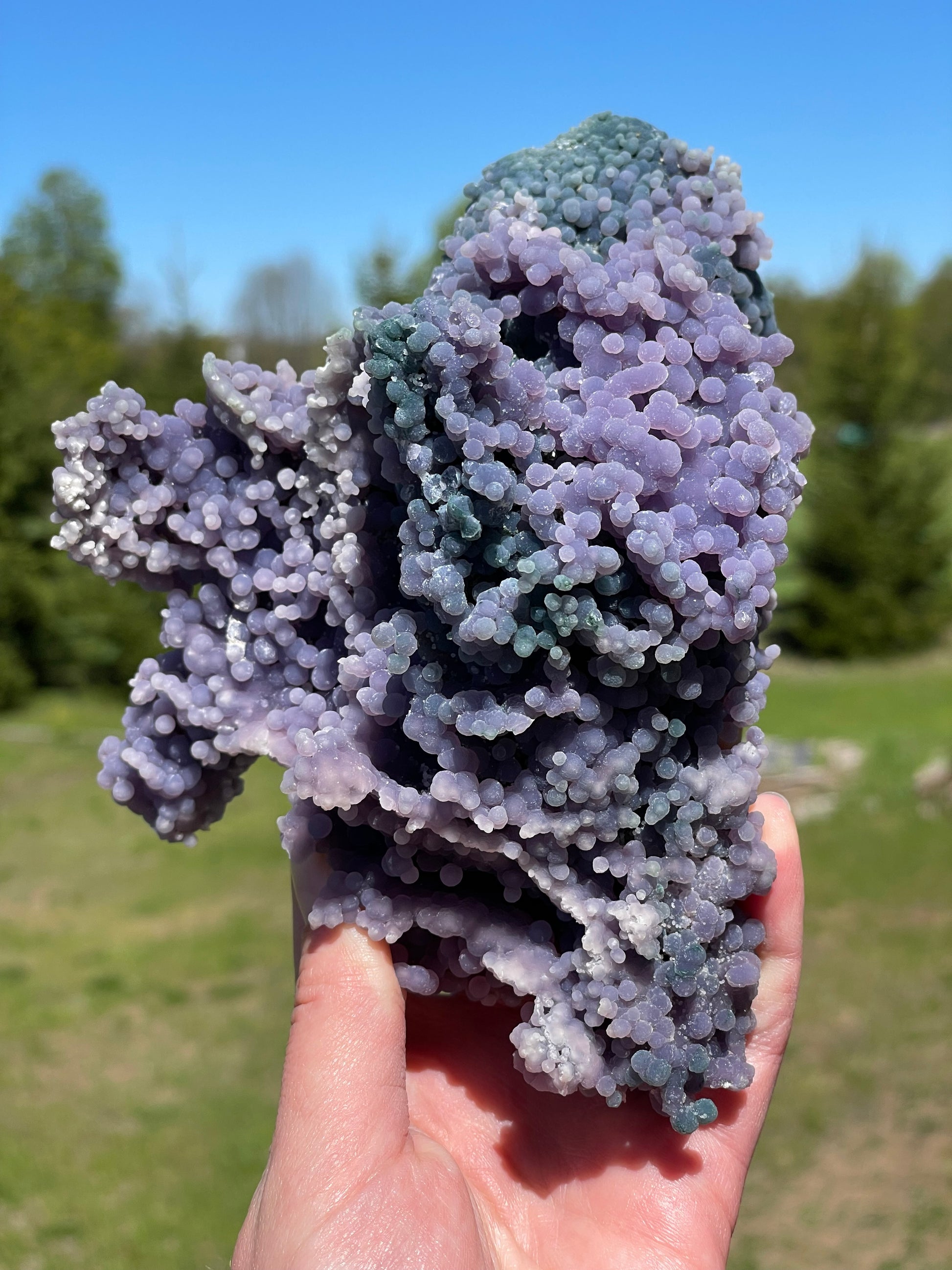This rare crystal is sourced from Indonesia and is admired for its naturally formed clusters that resemble bunches of grapes. It is considered a high-vibration metaphysical stone for connecting with higher realms.