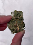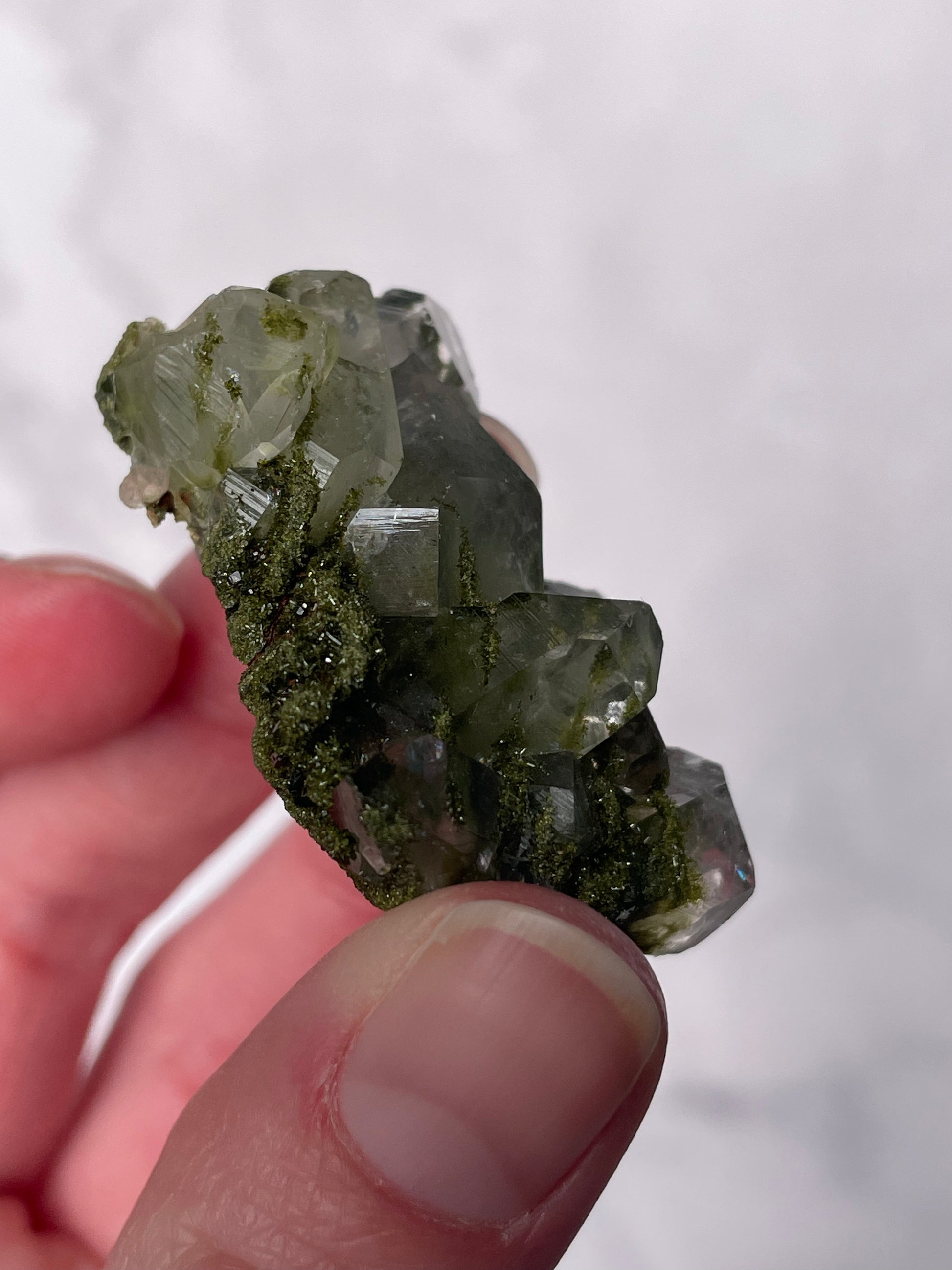 Typically dark green to blackish-green, Epidote forms in prismatic crystals or raw clusters with a vitreous luster. Some pieces display moss-like patterns and shimmering surfaces.