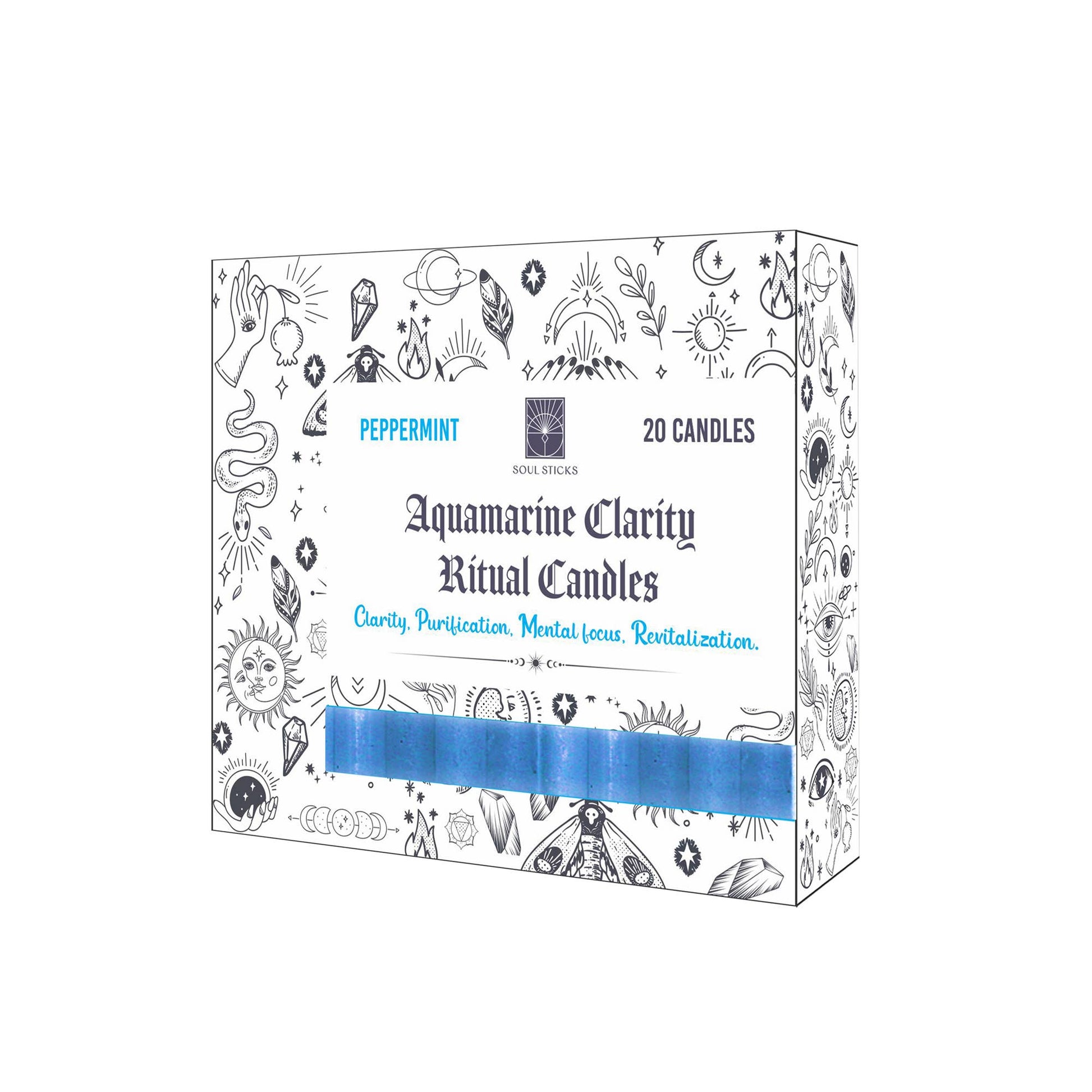 (Soul Sticks) Aquamarine Clarity Peppermint Ritual Candles Pack of 20, Burn Time: 2-2.5 hrs each Experience the allure of tranquility and the power of intention with our Scented Ritual Candles - a collection meticulously designed to elevate your personal ceremonies and create the ultimate ambience for relaxation and reflection. Each candle is a blend of harmony and purpose, crafted with an exclusive mix of premium-quality waxes and infused with a unique ensemble of essential oils, chosen not only for their enchanting fragrances but also for their therapeutic properties that encourage mental clarity, emotional balance, and spiritual awakening. Crafted to the highest standards of craftsmanship, these candles are made from premium, sustainable wax that ensures a long-lasting and steady flame.