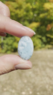 Sky-blue to sea-green with white wave-like patterns, often cut into polished cabochons or beads.