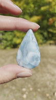 Light blue with soft white lines, Tear drop in shape, with polished surface. It has effects on four of the seven Chakras.