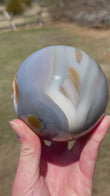 Polished agate spheres and slices reveal natural banding in earthy tones, whites, greys, and sometimes vibrant hues, with intricate swirling patterns.