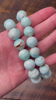 Polished 10 mm beads in soft sky-blue with occasional white swirls.