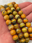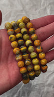 Bold, colorful 8 mm beads with banded patterns in yellow, orange, and black. Polished finish highlights the contrast.
