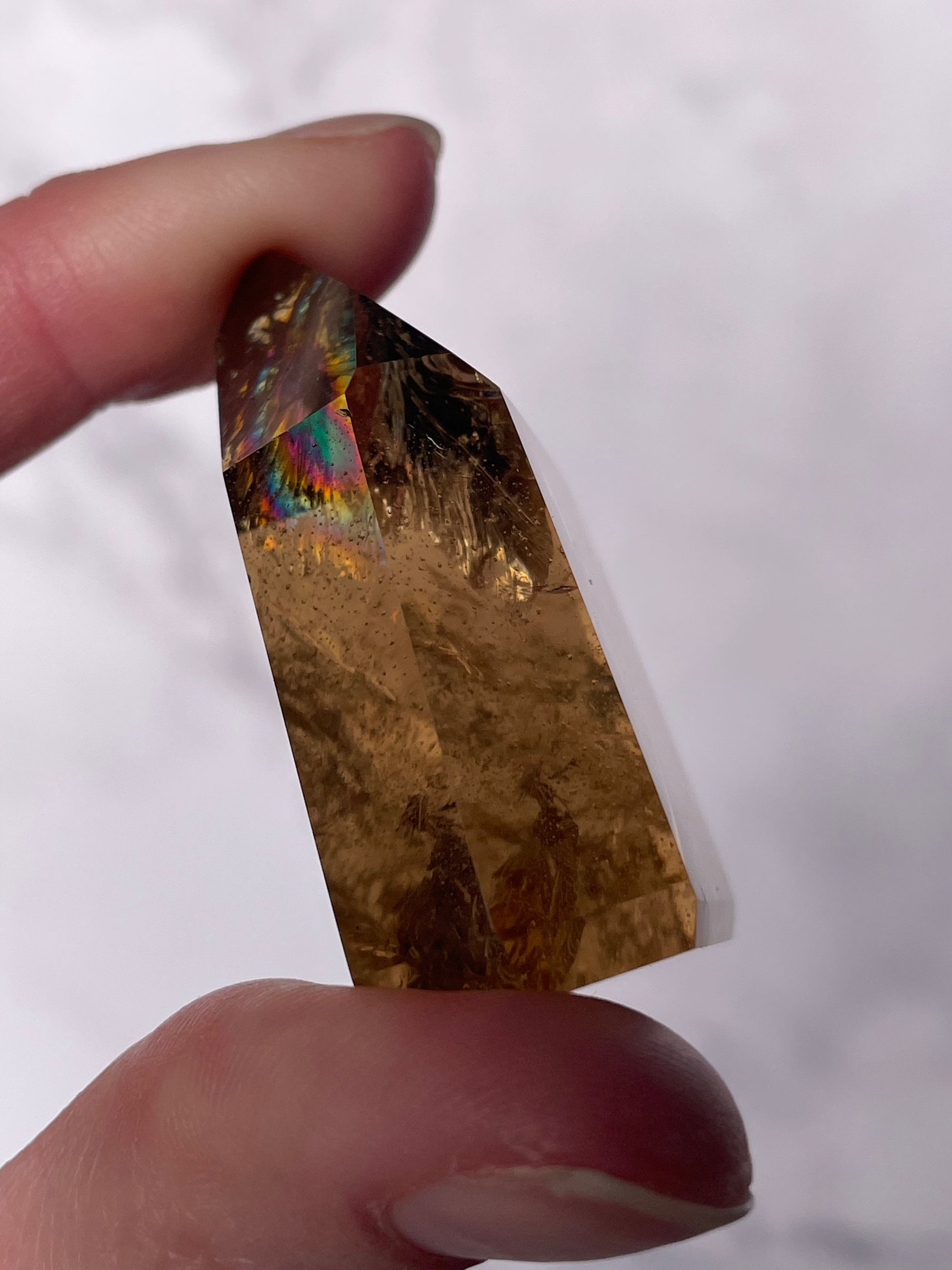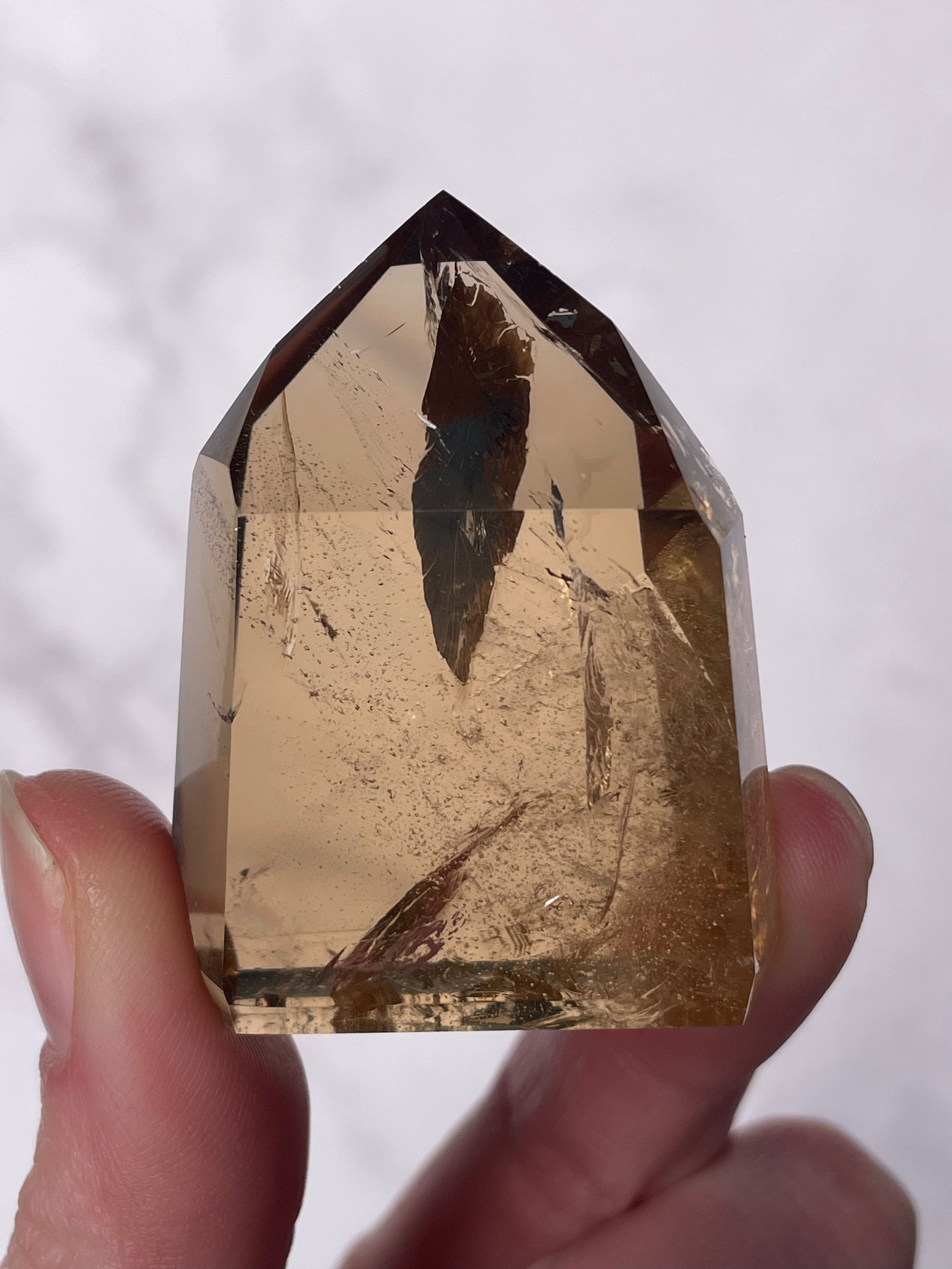 Features polished tower points in golden yellow to honey tones, often with natural internal inclusions. The tower shape directs energy upward, making it ideal for intention setting and display.