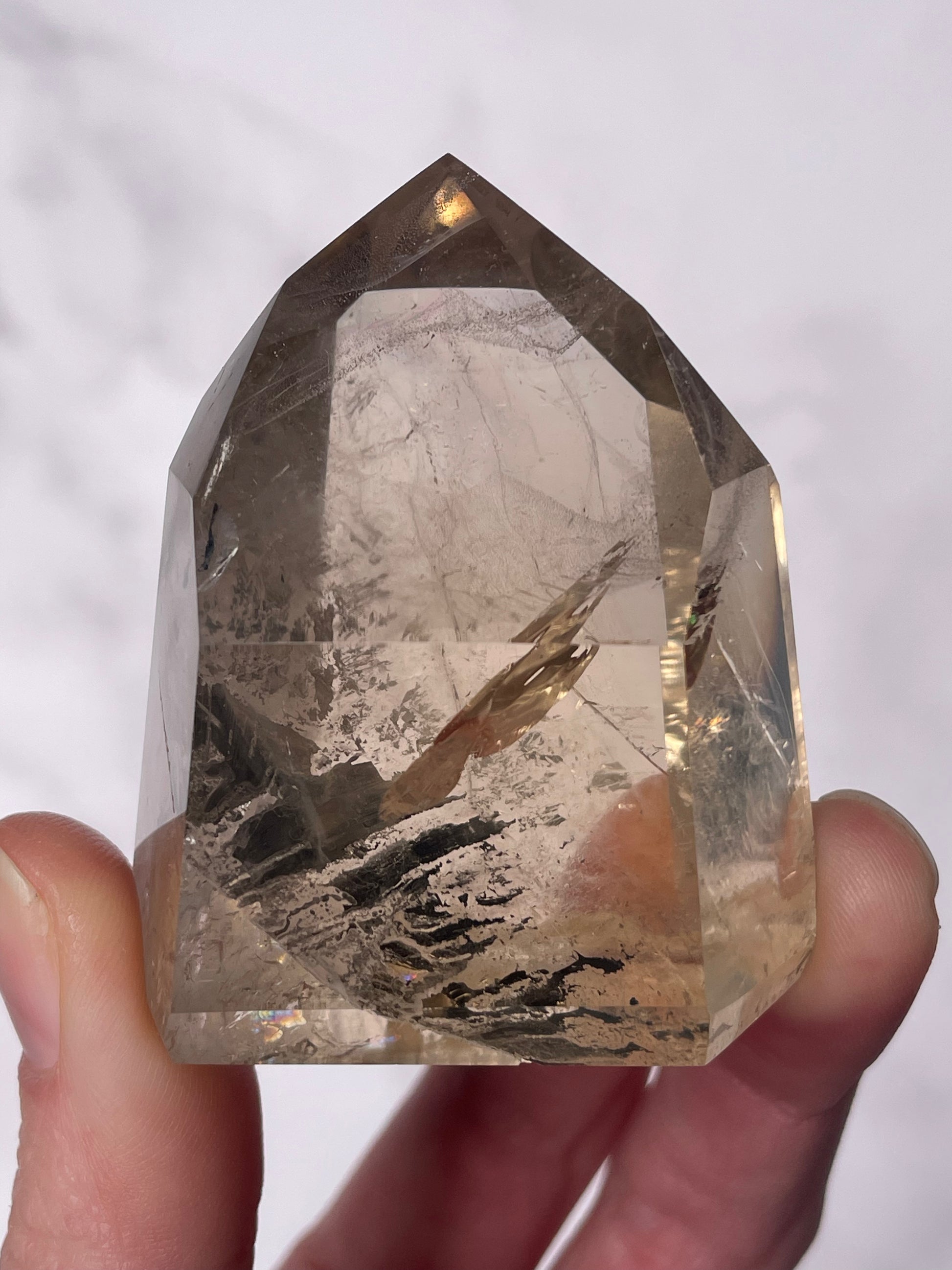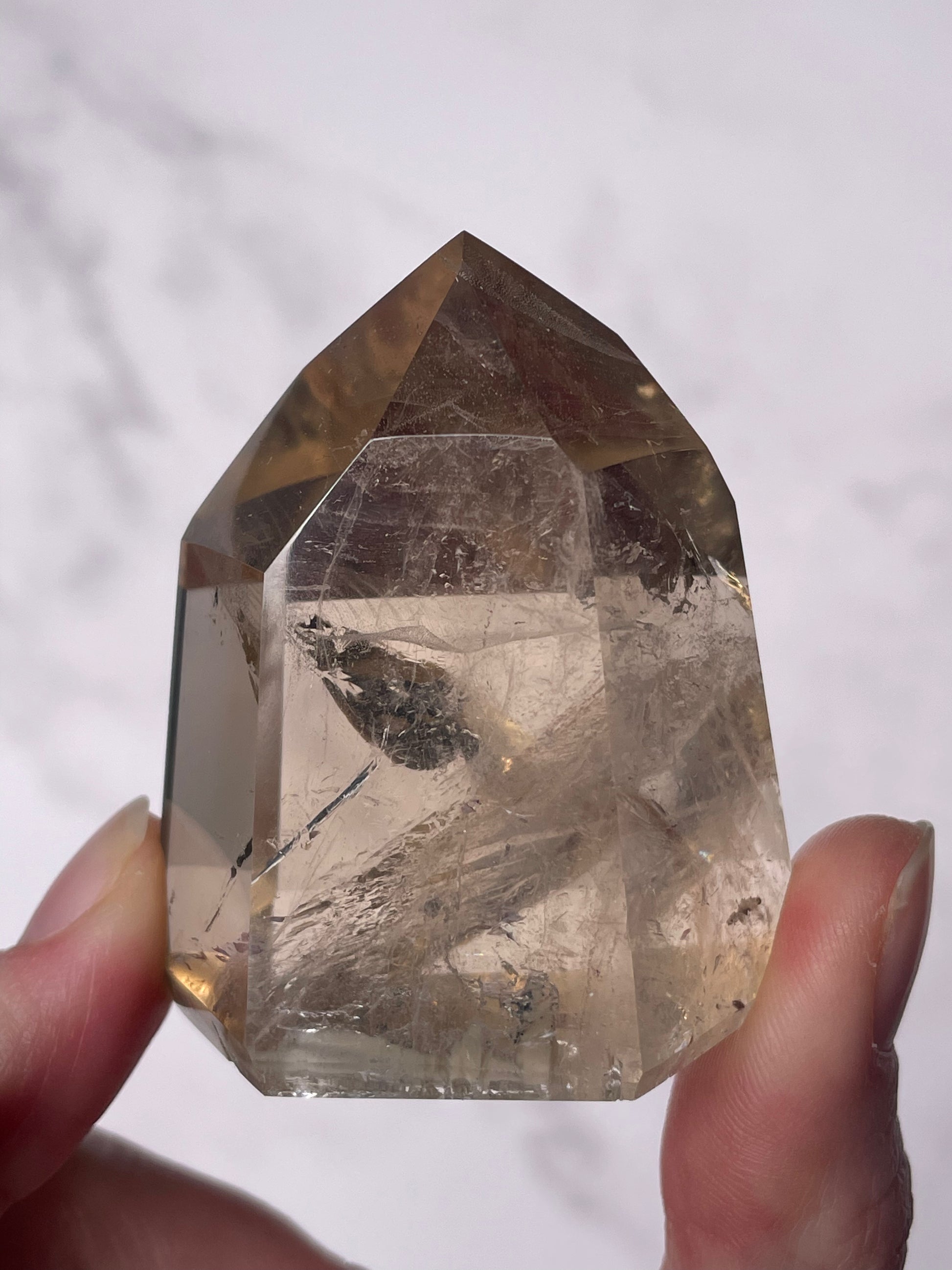 Features polished tower points in golden yellow to honey tones, often with natural internal inclusions. The tower shape directs energy upward, making it ideal for intention setting and display.