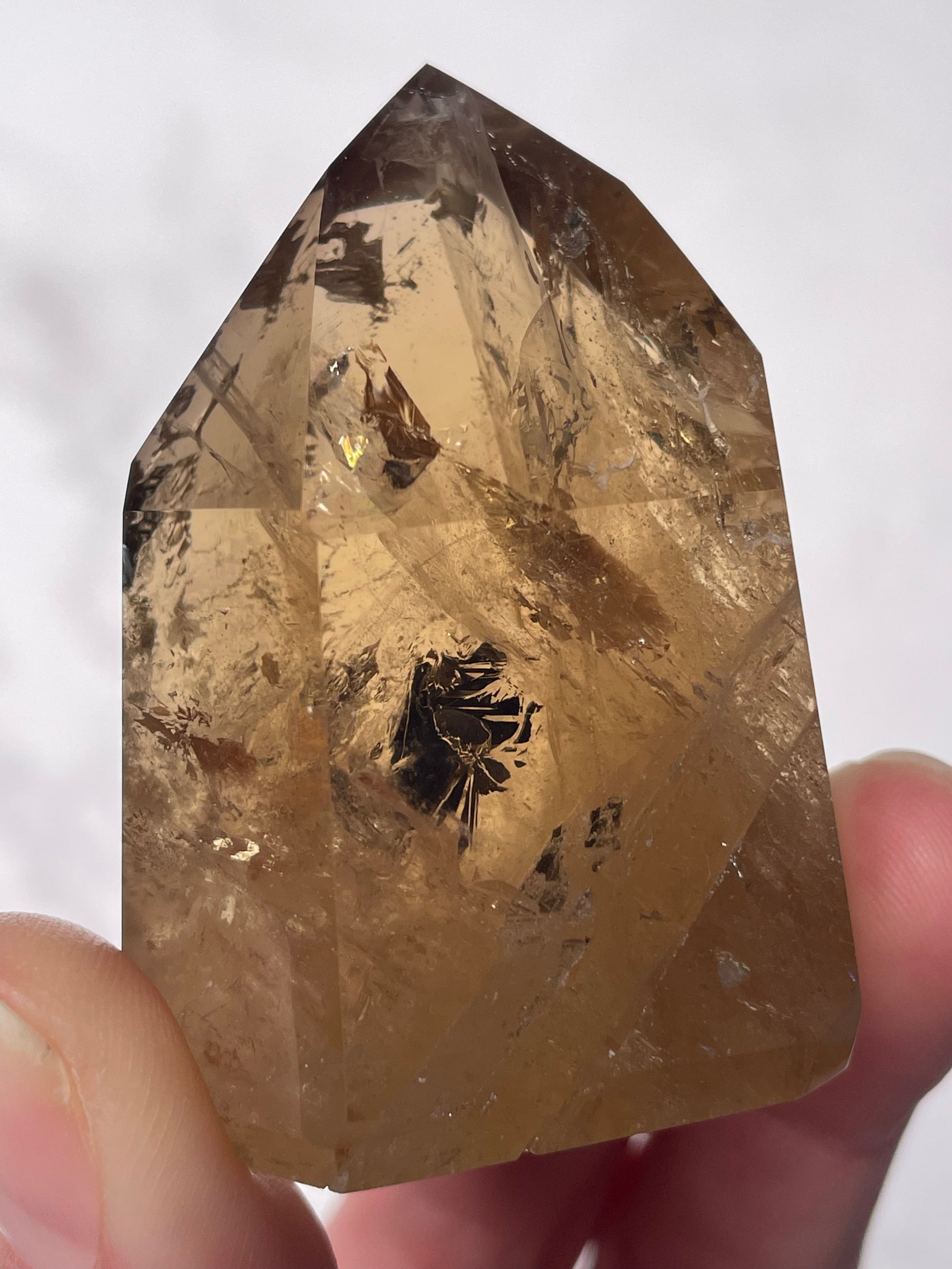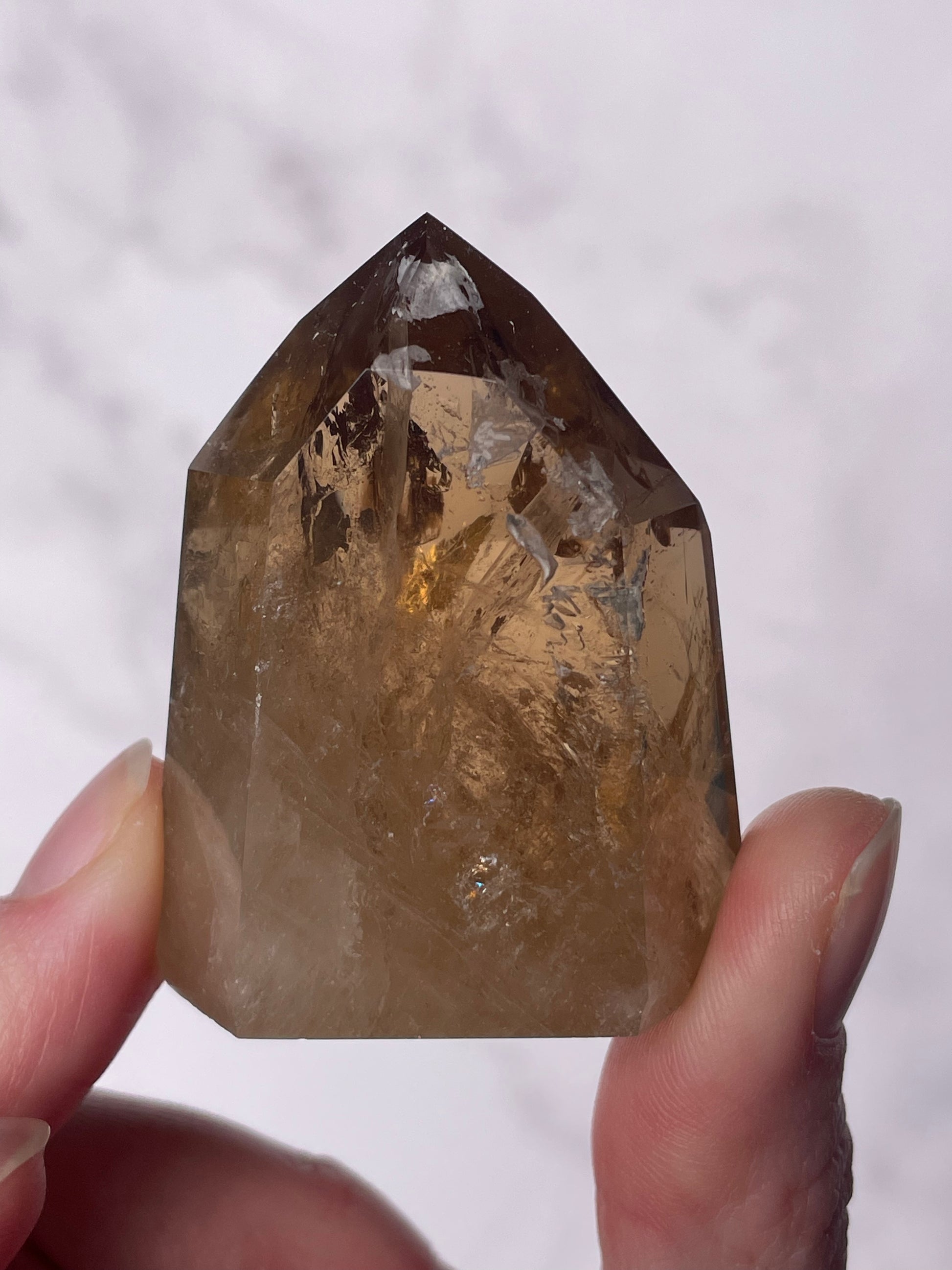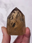 Features polished tower points in golden yellow to honey tones, often with natural internal inclusions. The tower shape directs energy upward, making it ideal for intention setting and display.