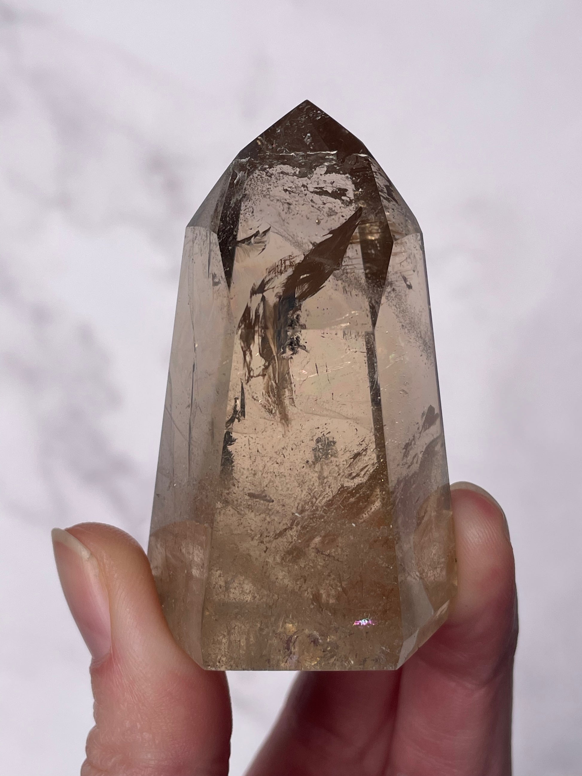 Features polished tower points in golden yellow to honey tones, often with natural internal inclusions. The tower shape directs energy upward, making it ideal for intention setting and display.