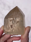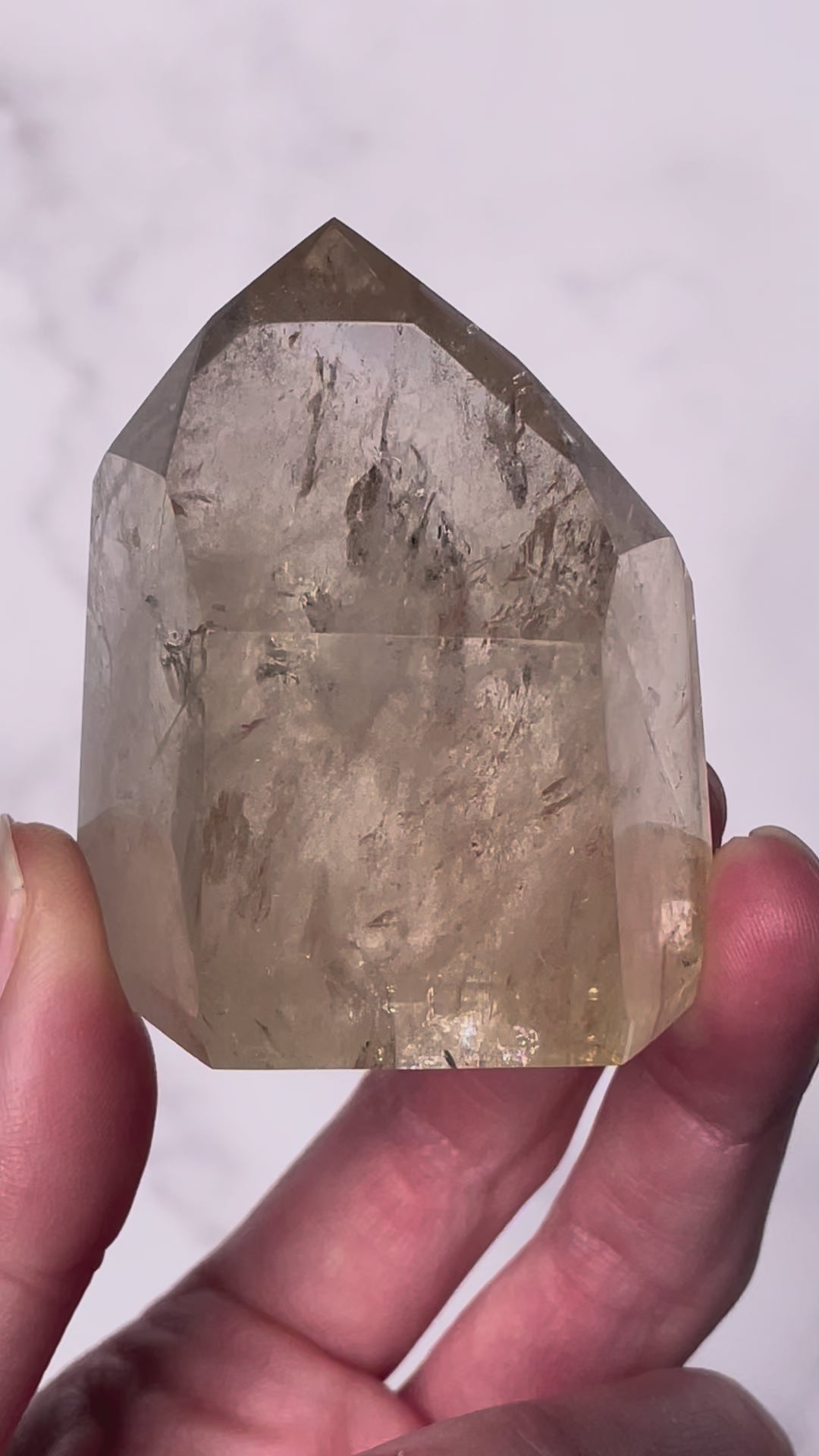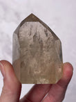 Features polished tower points in golden yellow to honey tones, often with natural internal inclusions. The tower shape directs energy upward, making it ideal for intention setting and display.