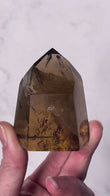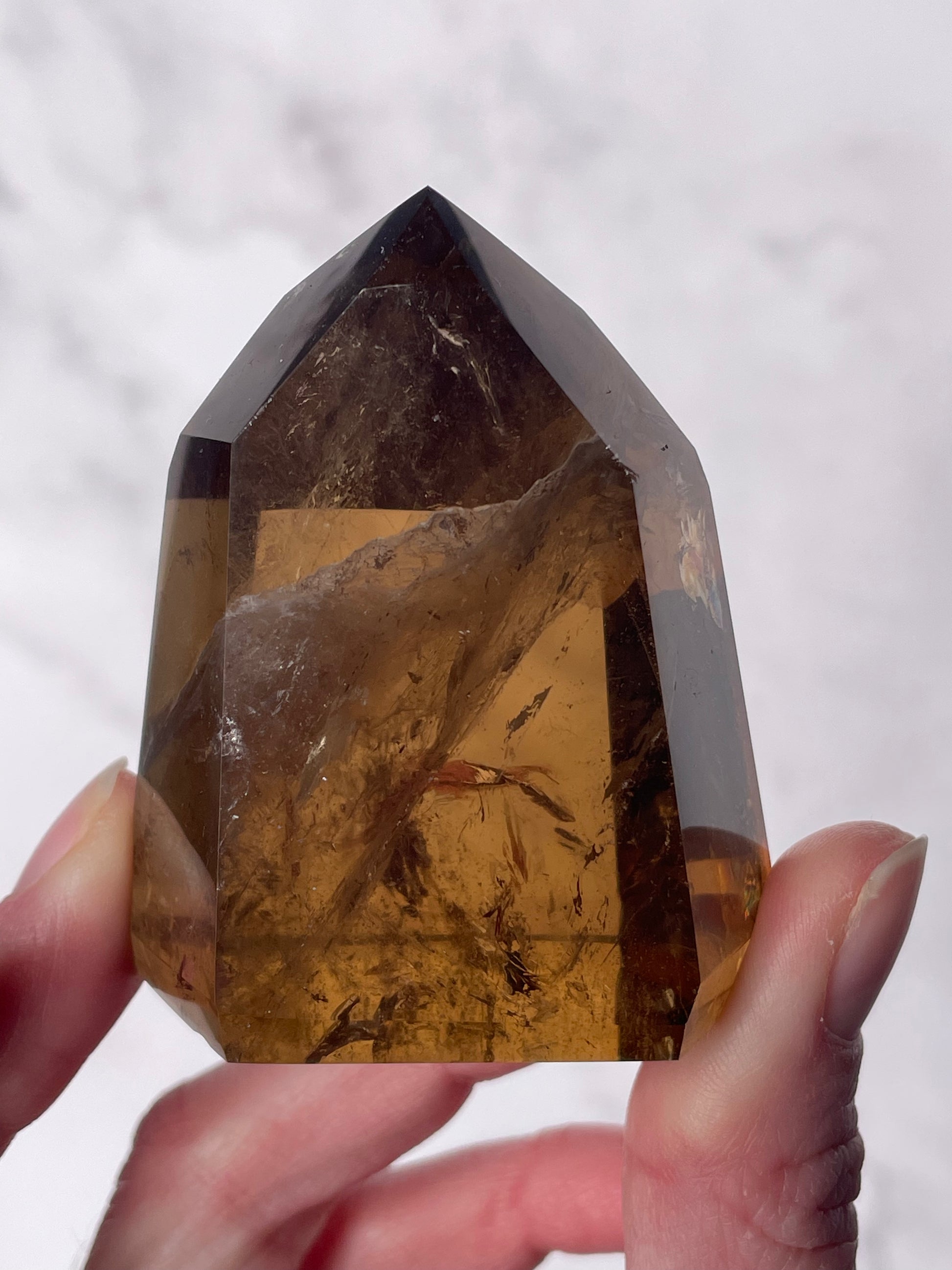 Features polished tower points in golden yellow to honey tones, often with natural internal inclusions. The tower shape directs energy upward, making it ideal for intention setting and display.