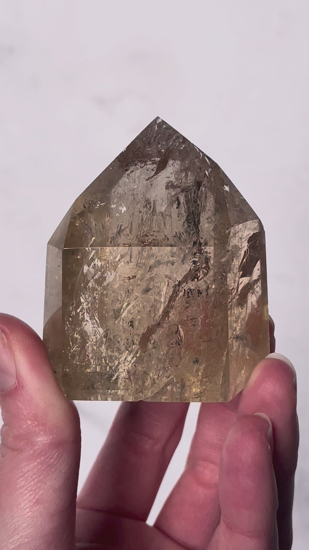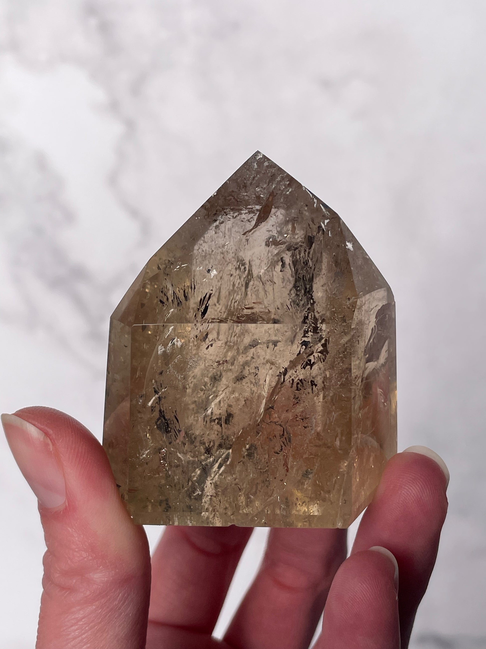 Features polished tower points in golden yellow to honey tones, often with natural internal inclusions. The tower shape directs energy upward, making it ideal for intention setting and display.