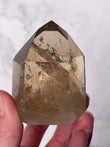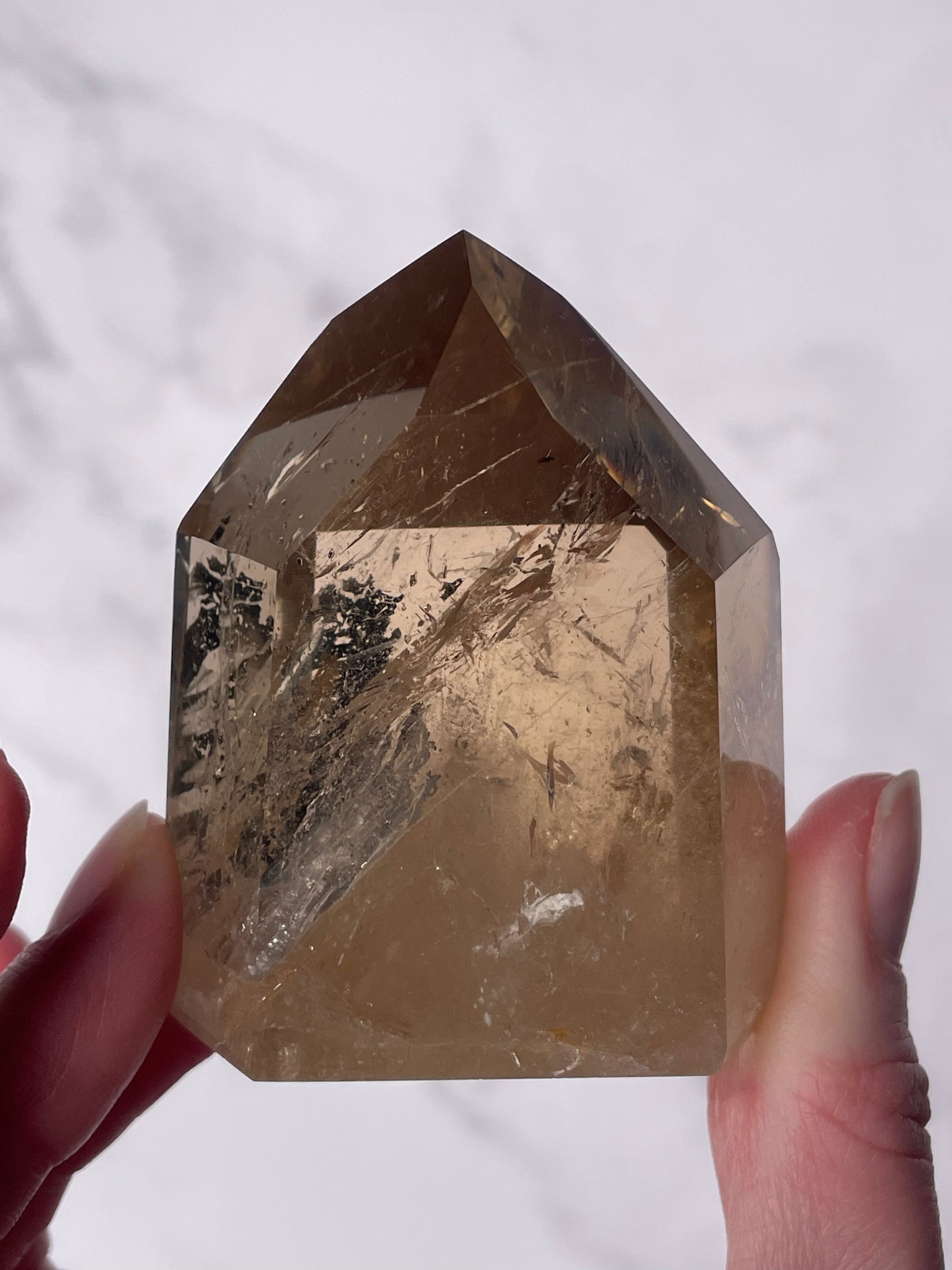 Features polished tower points in golden yellow to honey tones, often with natural internal inclusions. The tower shape directs energy upward, making it ideal for intention setting and display.