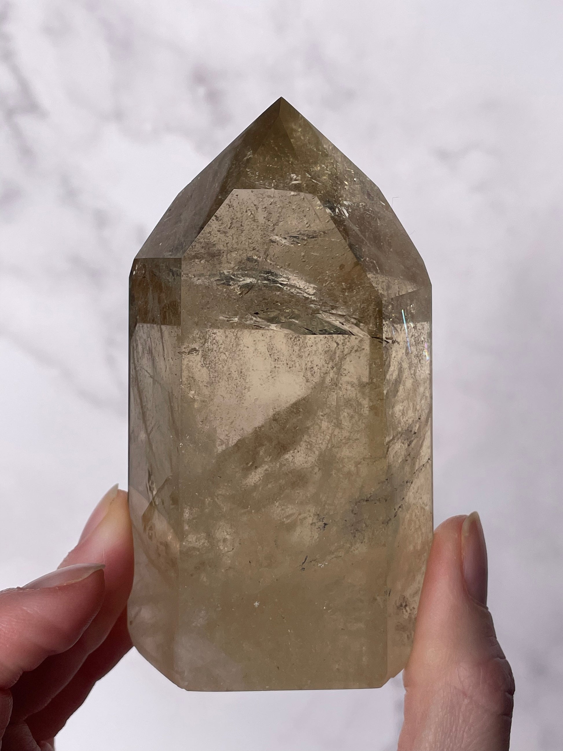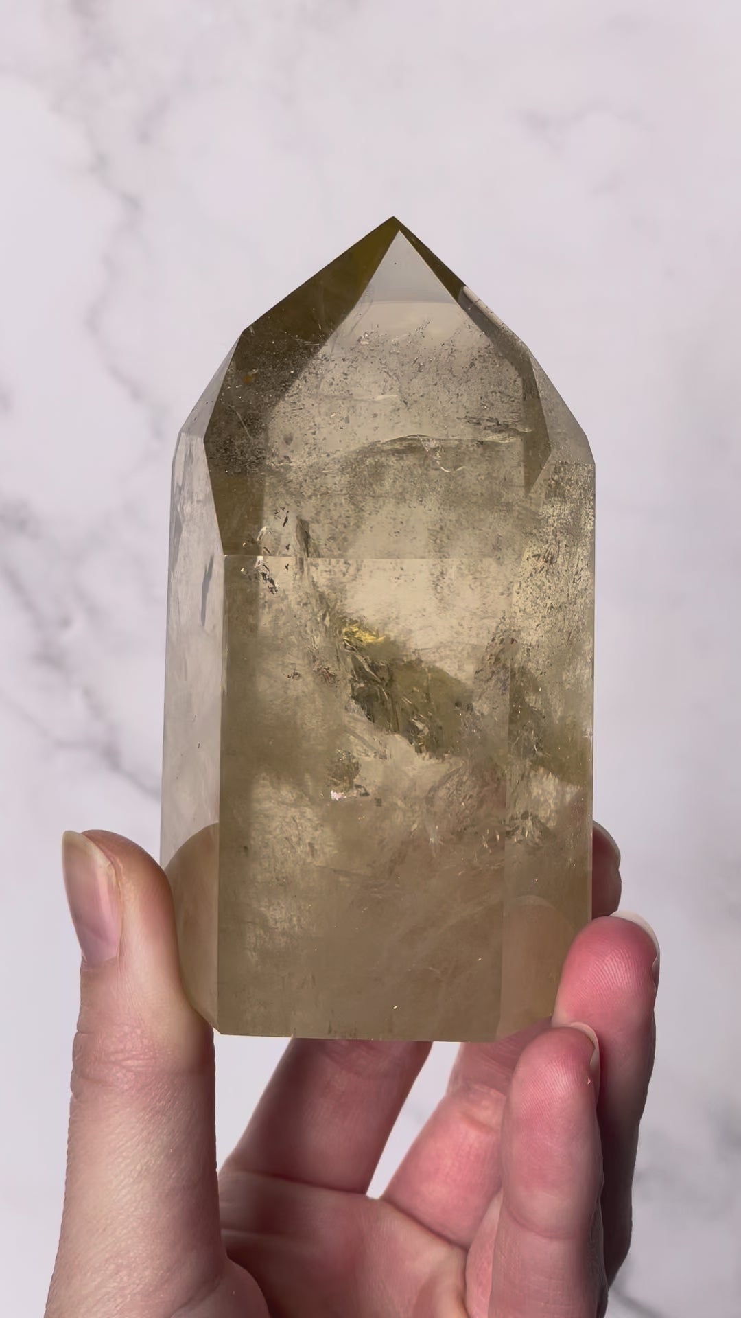 Features polished tower points in golden yellow to honey tones, often with natural internal inclusions. The tower shape directs energy upward, making it ideal for intention setting and display.