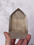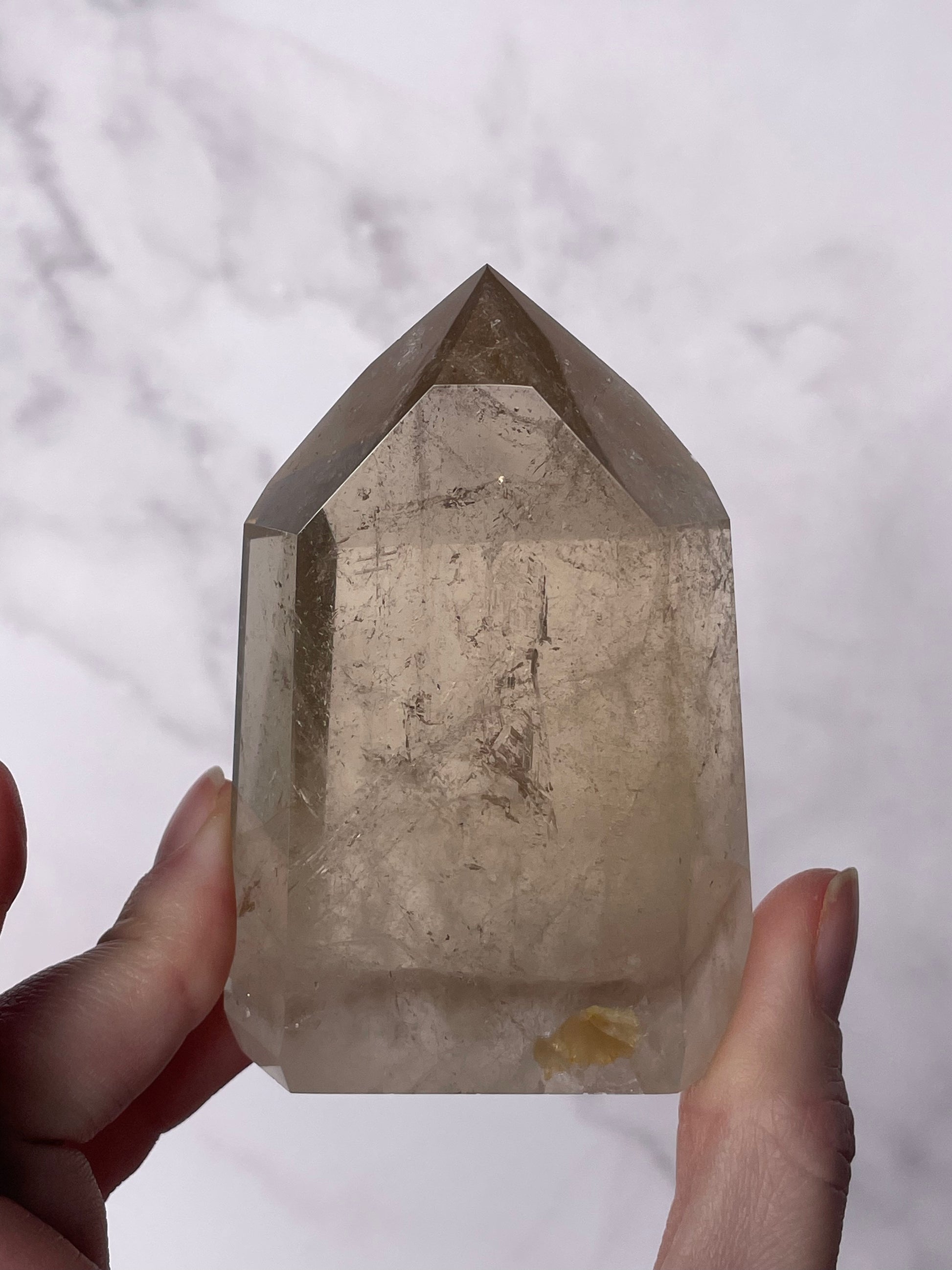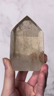 Features polished tower points in golden yellow to honey tones, often with natural internal inclusions. The tower shape directs energy upward, making it ideal for intention setting and display.
