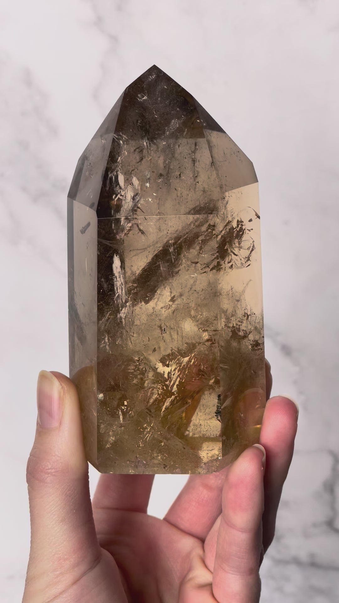 Features polished tower points in golden yellow to honey tones, often with natural internal inclusions. The tower shape directs energy upward, making it ideal for intention setting and display.