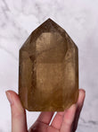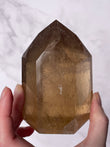 Features polished tower points in golden yellow to honey tones, often with natural internal inclusions. The tower shape directs energy upward, making it ideal for intention setting and display.