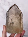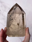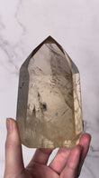 Features polished tower points in golden yellow to honey tones, often with natural internal inclusions. The tower shape directs energy upward, making it ideal for intention setting and display.
