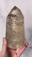 Features polished tower points in golden yellow to honey tones, often with natural internal inclusions. The tower shape directs energy upward, making it ideal for intention setting and display.