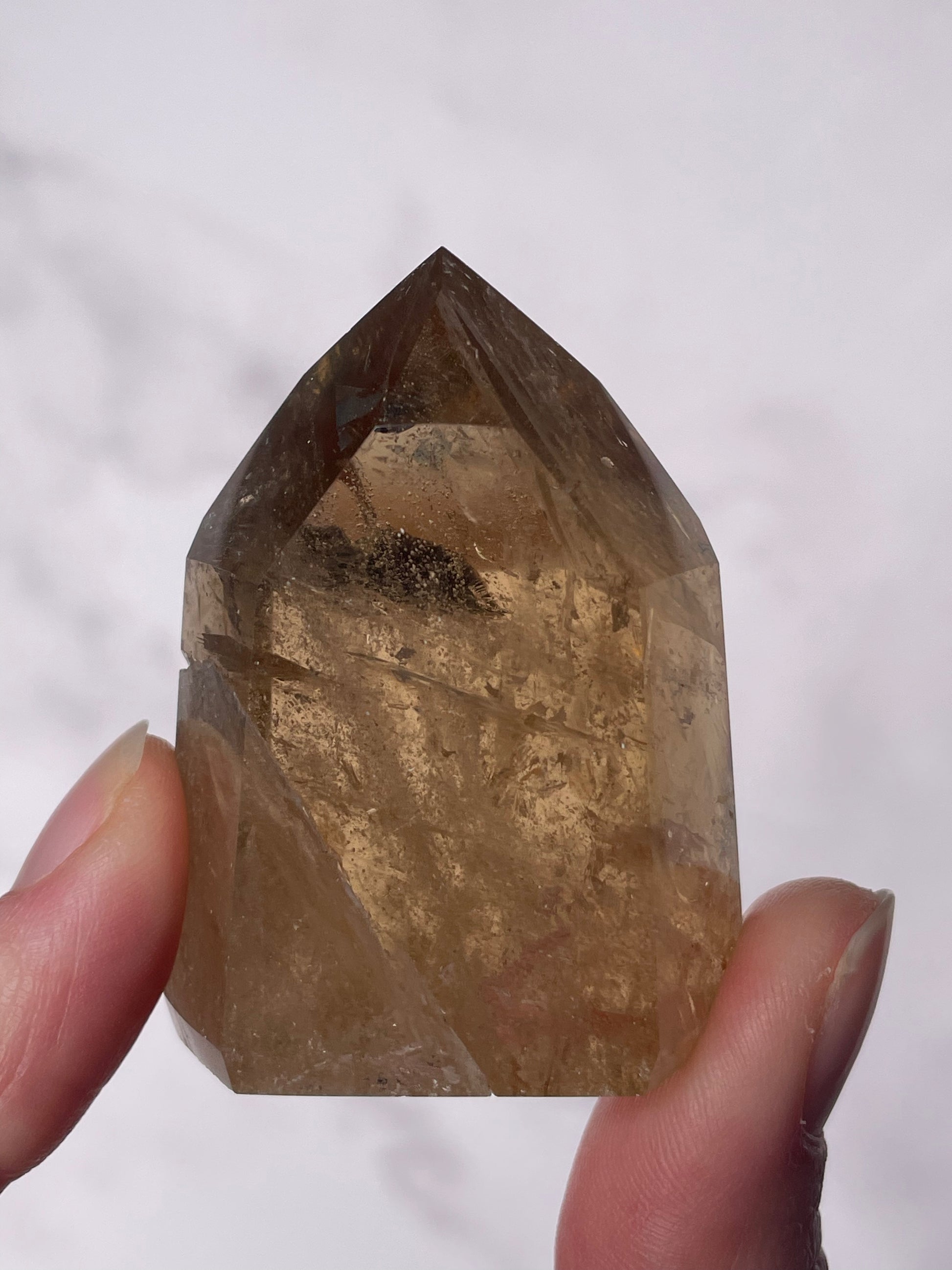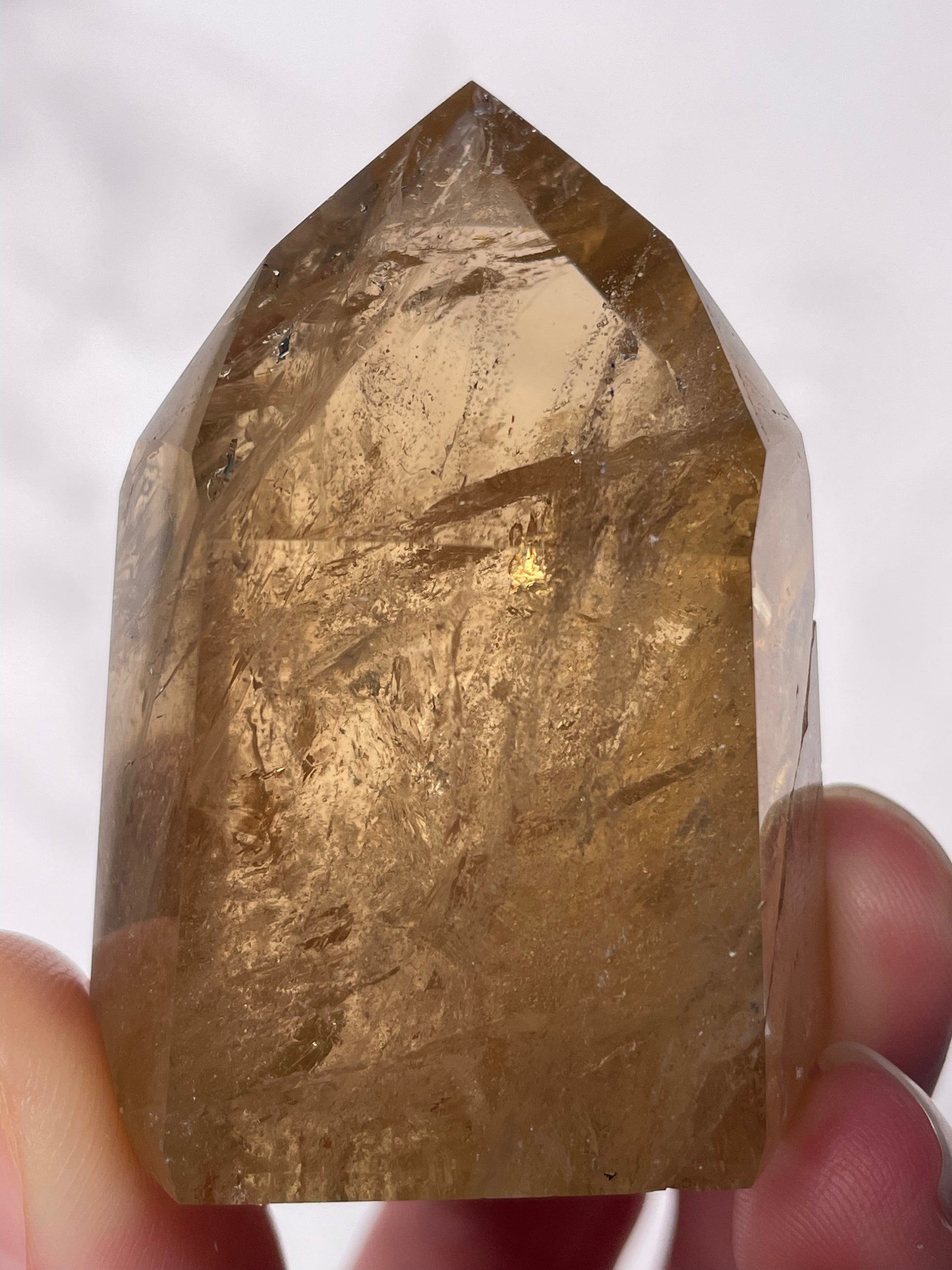Features polished tower points in golden yellow to honey tones, often with natural internal inclusions. The tower shape directs energy upward, making it ideal for intention setting and display.