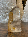 Clear quartz infused with golden-yellow to orange iron oxide veins, polished into clusters or points.
