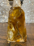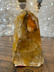 Clear quartz infused with golden-yellow to orange iron oxide veins, polished into clusters or points.