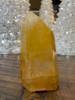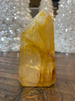 Clear quartz infused with golden-yellow to orange iron oxide veins, polished into clusters or points.