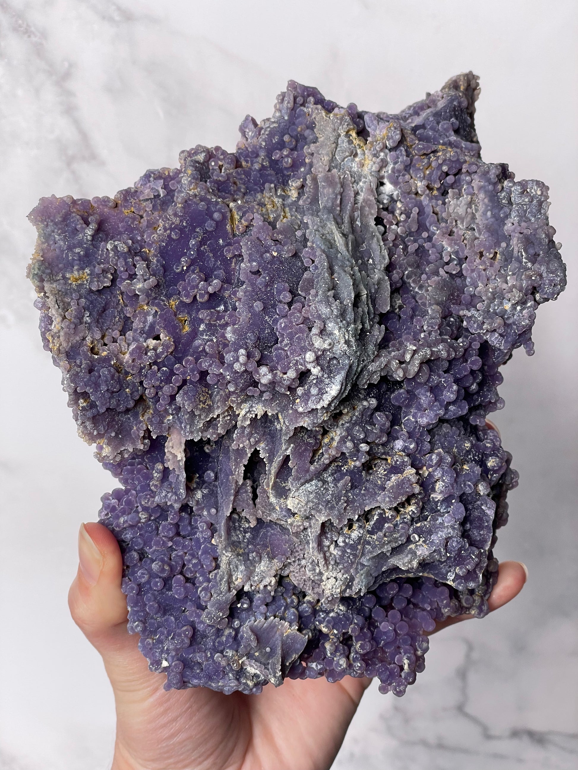 This rare crystal is sourced from Indonesia and is admired for its naturally formed clusters that resemble bunches of grapes. It is considered a high-vibration metaphysical stone for connecting with higher realms.