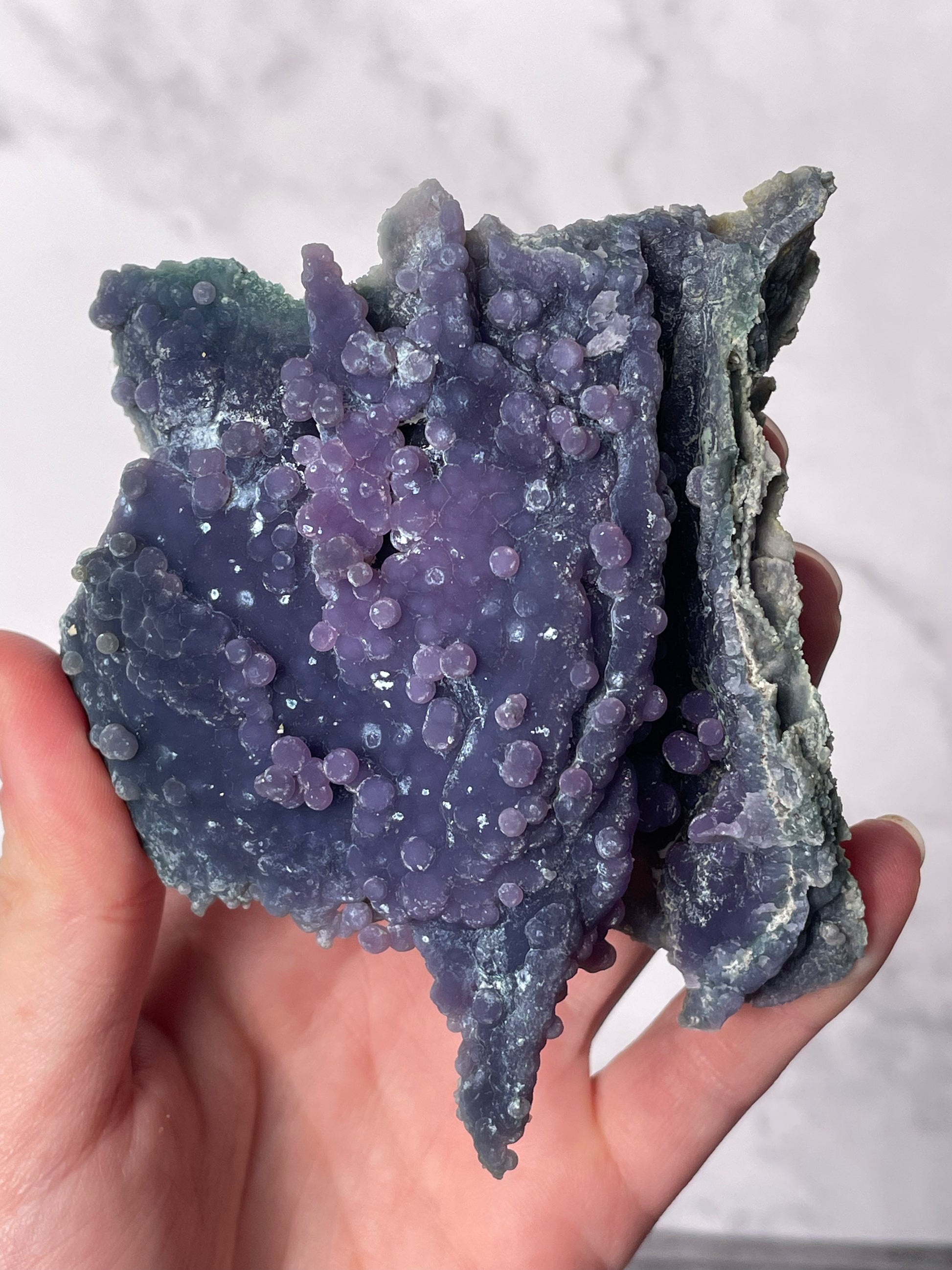 This rare crystal is sourced from Indonesia and is admired for its naturally formed clusters that resemble bunches of grapes. It is considered a high-vibration metaphysical stone for connecting with higher realms.