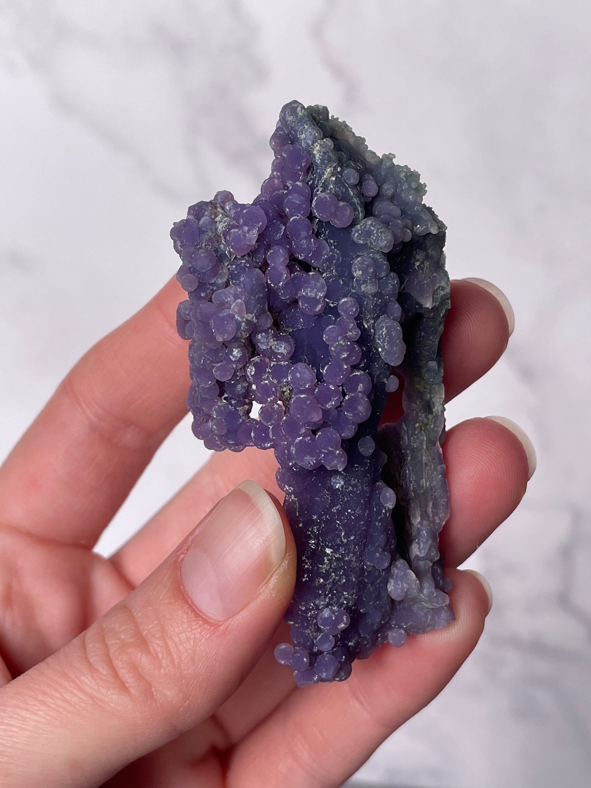 This rare crystal is sourced from Indonesia and is admired for its naturally formed clusters that resemble bunches of grapes. It is considered a high-vibration metaphysical stone for connecting with higher realms.