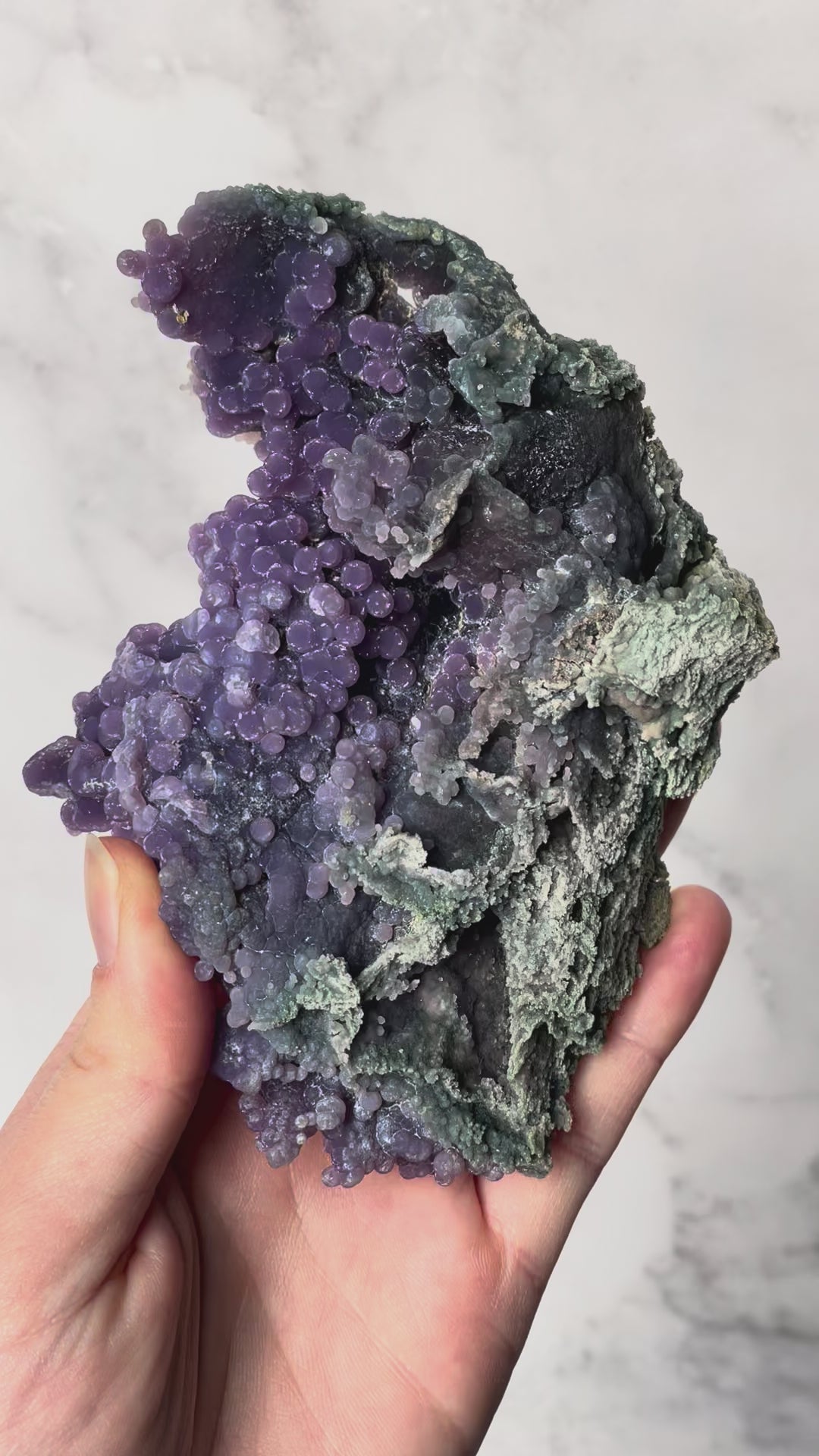 This rare crystal is sourced from Indonesia and is admired for its naturally formed clusters that resemble bunches of grapes. It is considered a high-vibration metaphysical stone for connecting with higher realms.