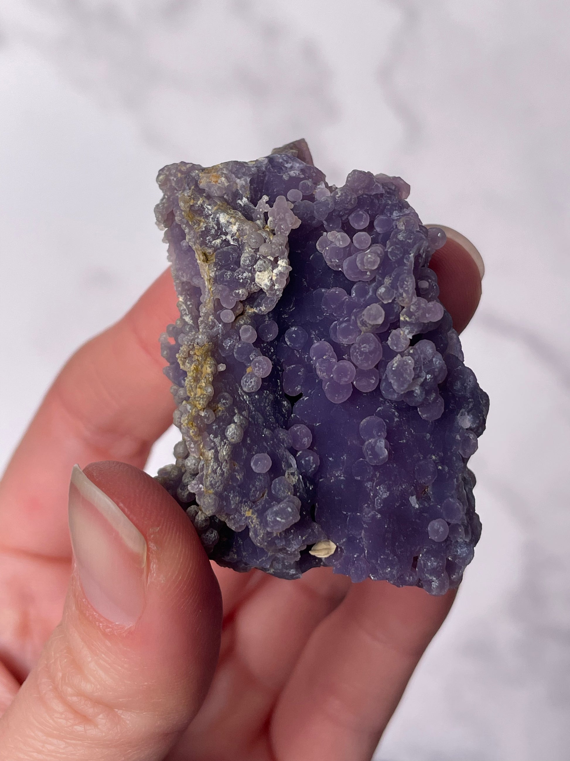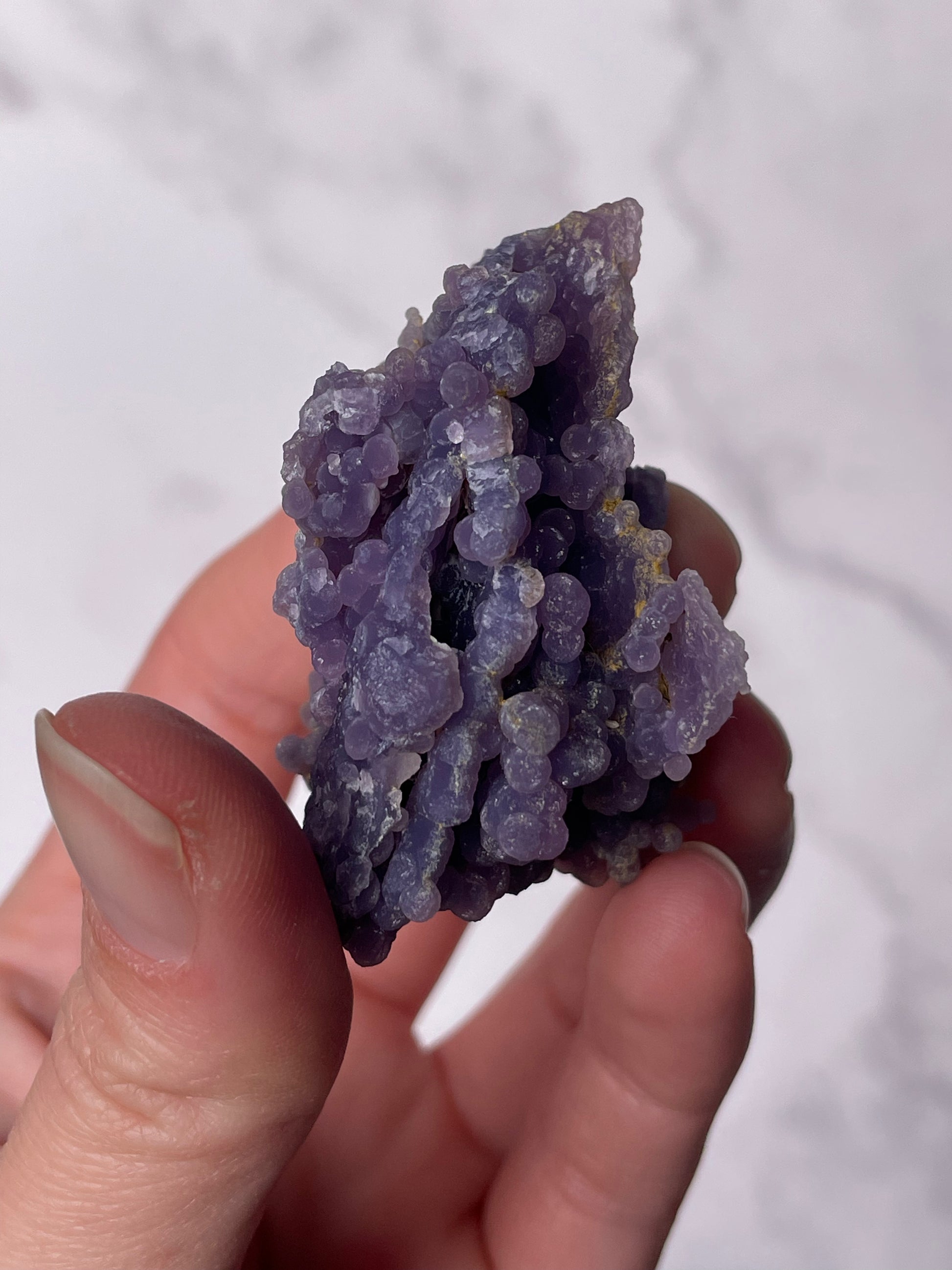 This rare crystal is sourced from Indonesia and is admired for its naturally formed clusters that resemble bunches of grapes. It is considered a high-vibration metaphysical stone for connecting with higher realms.