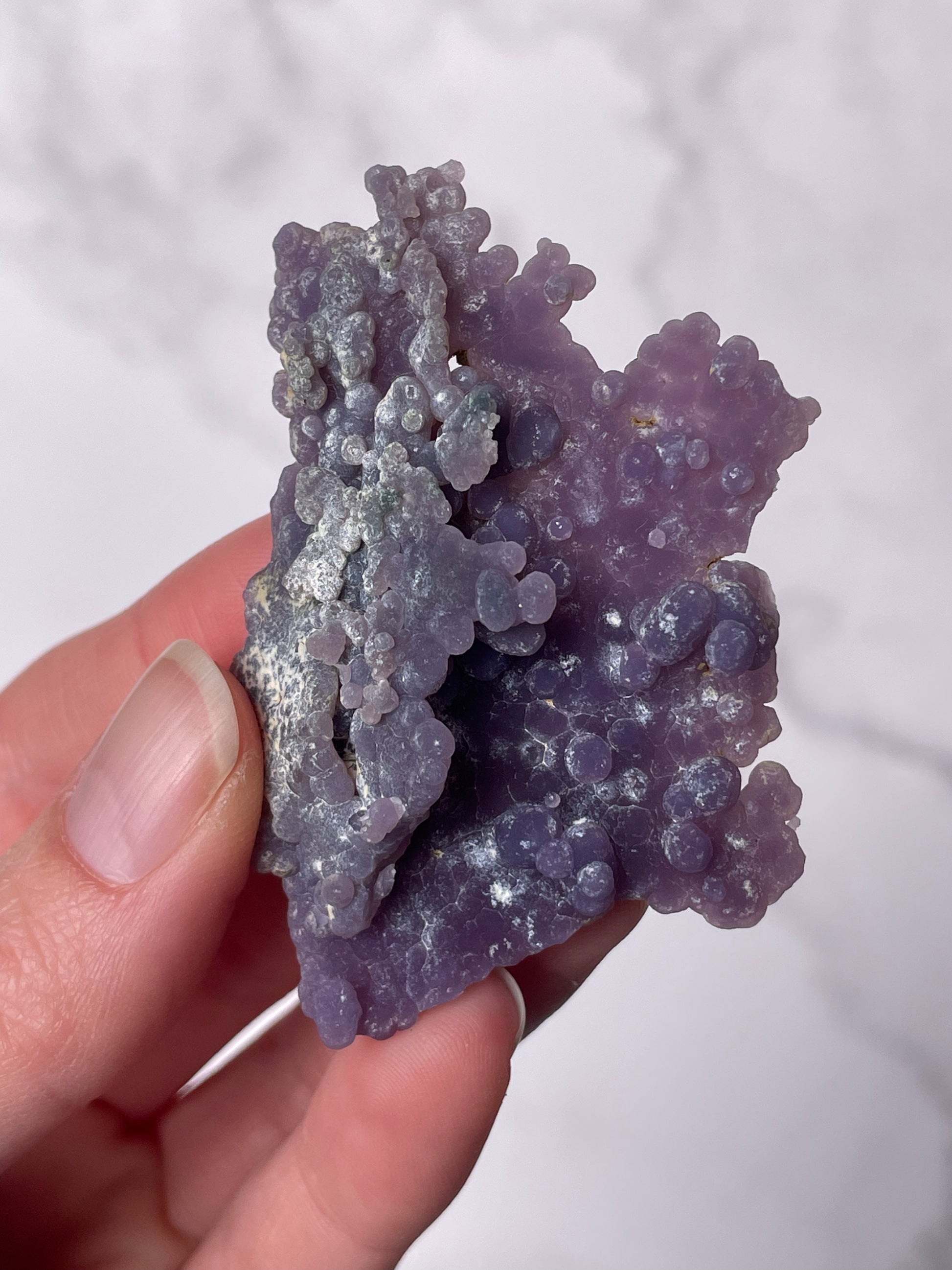 This rare crystal is sourced from Indonesia and is admired for its naturally formed clusters that resemble bunches of grapes. It is considered a high-vibration metaphysical stone for connecting with higher realms.