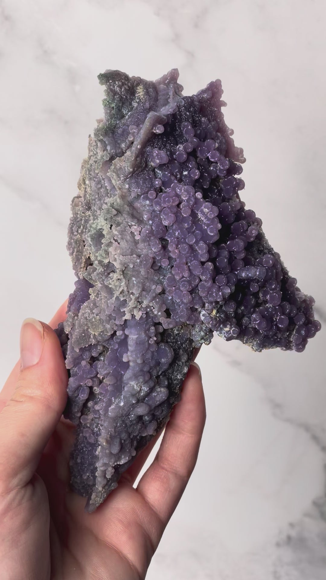 This rare crystal is sourced from Indonesia and is admired for its naturally formed clusters that resemble bunches of grapes. It is considered a high-vibration metaphysical stone for connecting with higher realms.