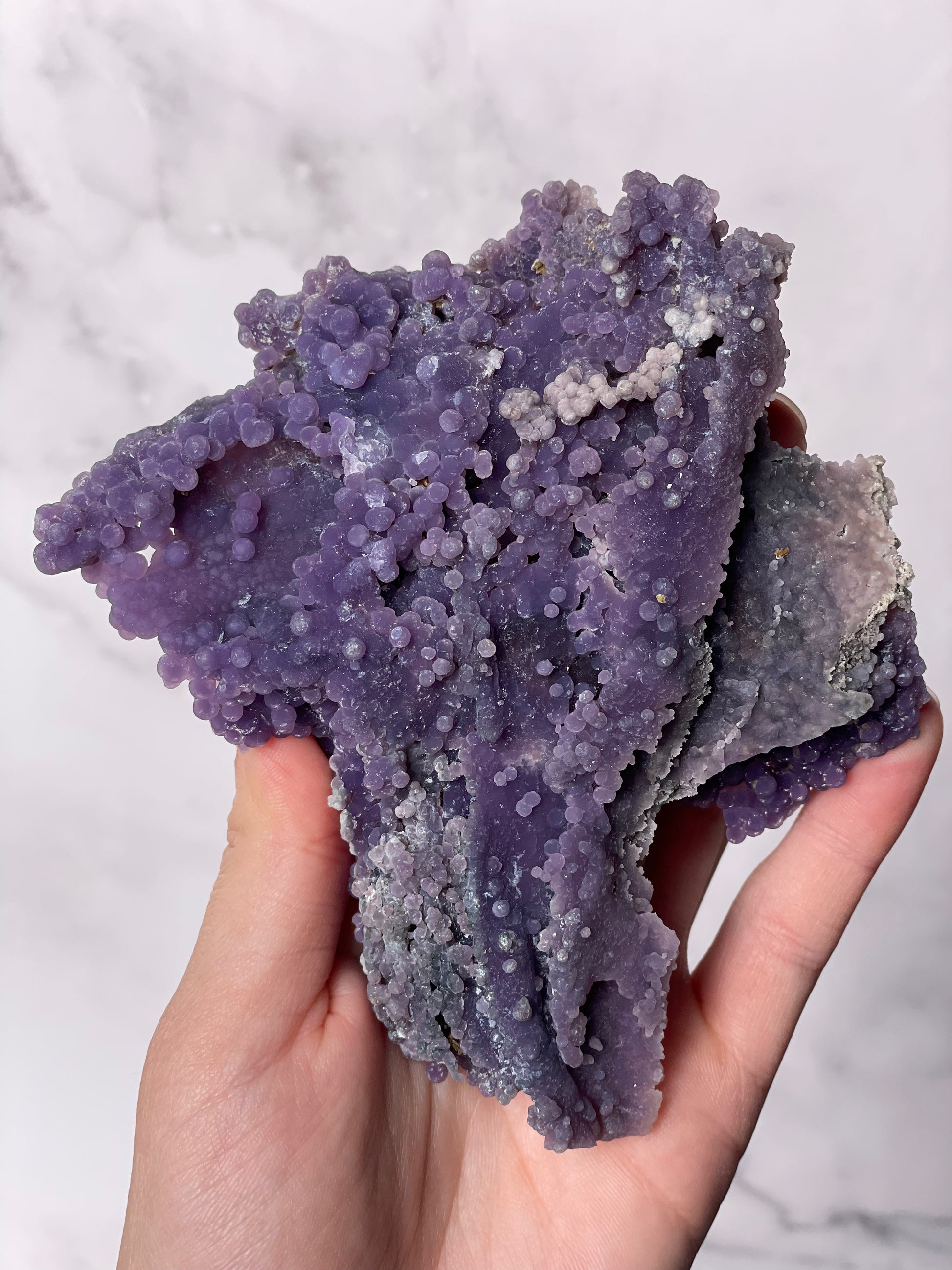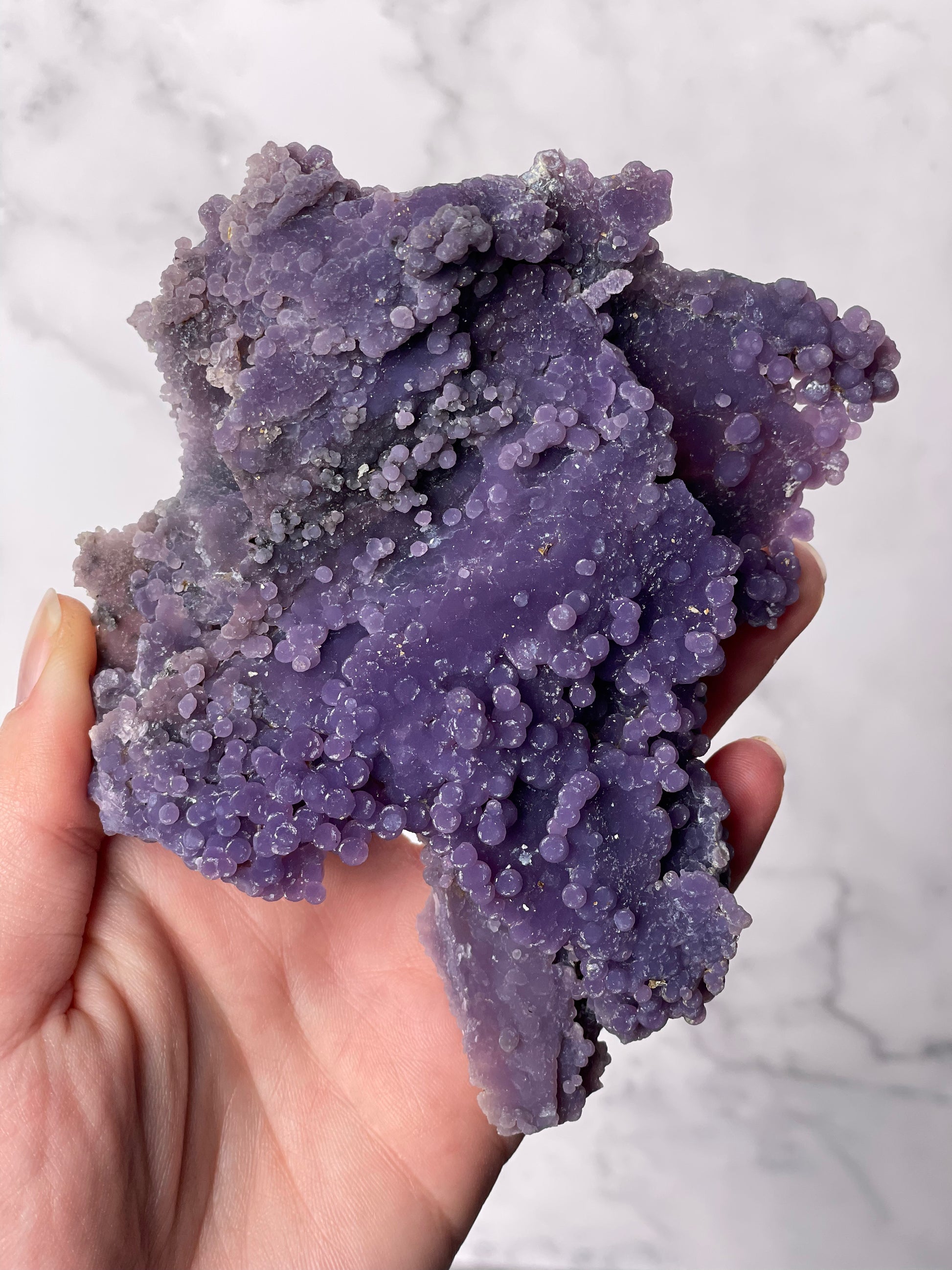 This rare crystal is sourced from Indonesia and is admired for its naturally formed clusters that resemble bunches of grapes. It is considered a high-vibration metaphysical stone for connecting with higher realms.