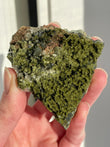 Typically dark green to blackish-green, Epidote forms in prismatic crystals or raw clusters with a vitreous luster. Some pieces display moss-like patterns and shimmering surfaces.