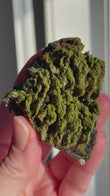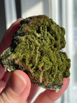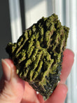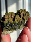 Typically dark green to blackish-green, Epidote forms in prismatic crystals or raw clusters with a vitreous luster. Some pieces display moss-like patterns and shimmering surfaces.