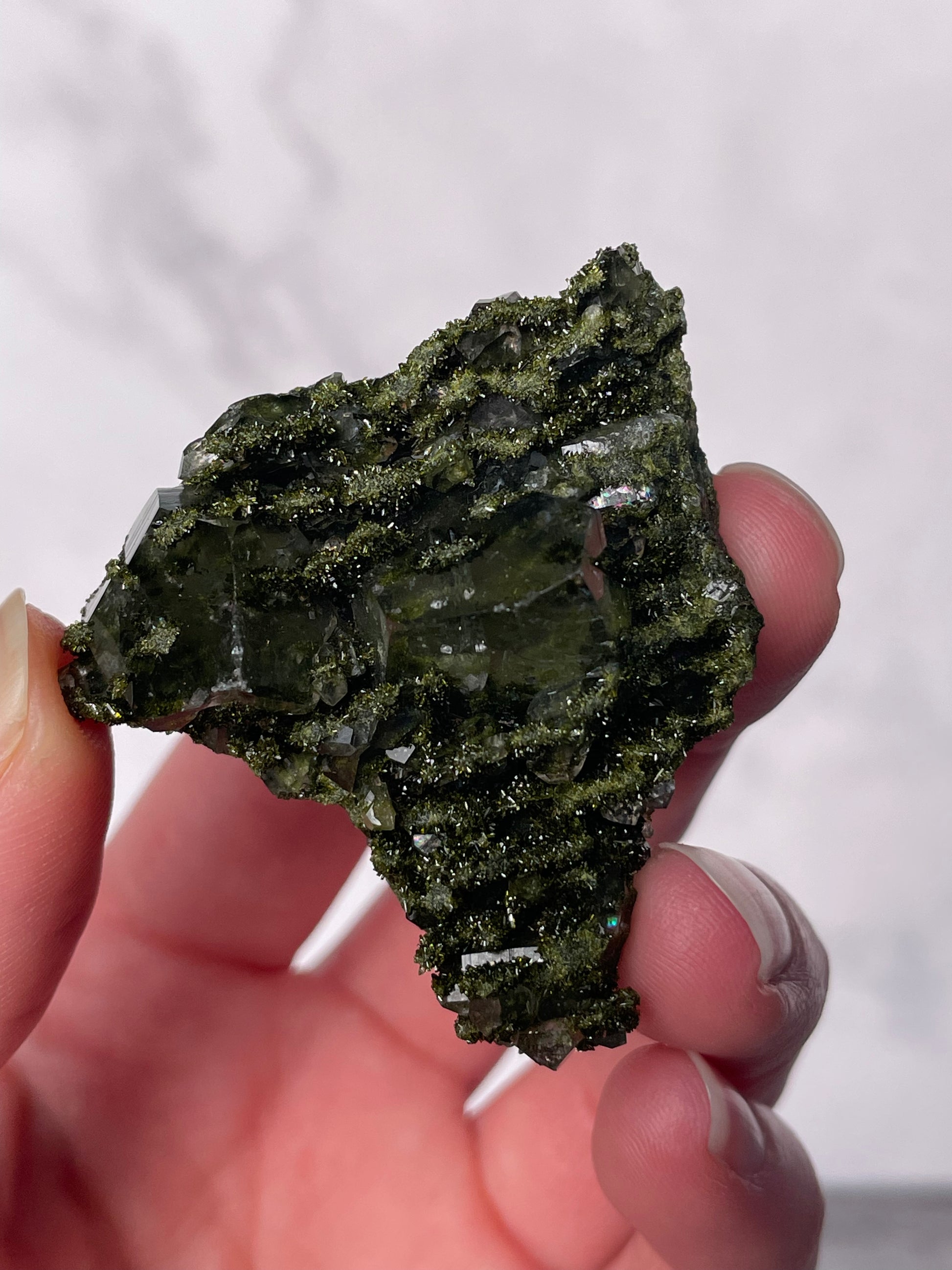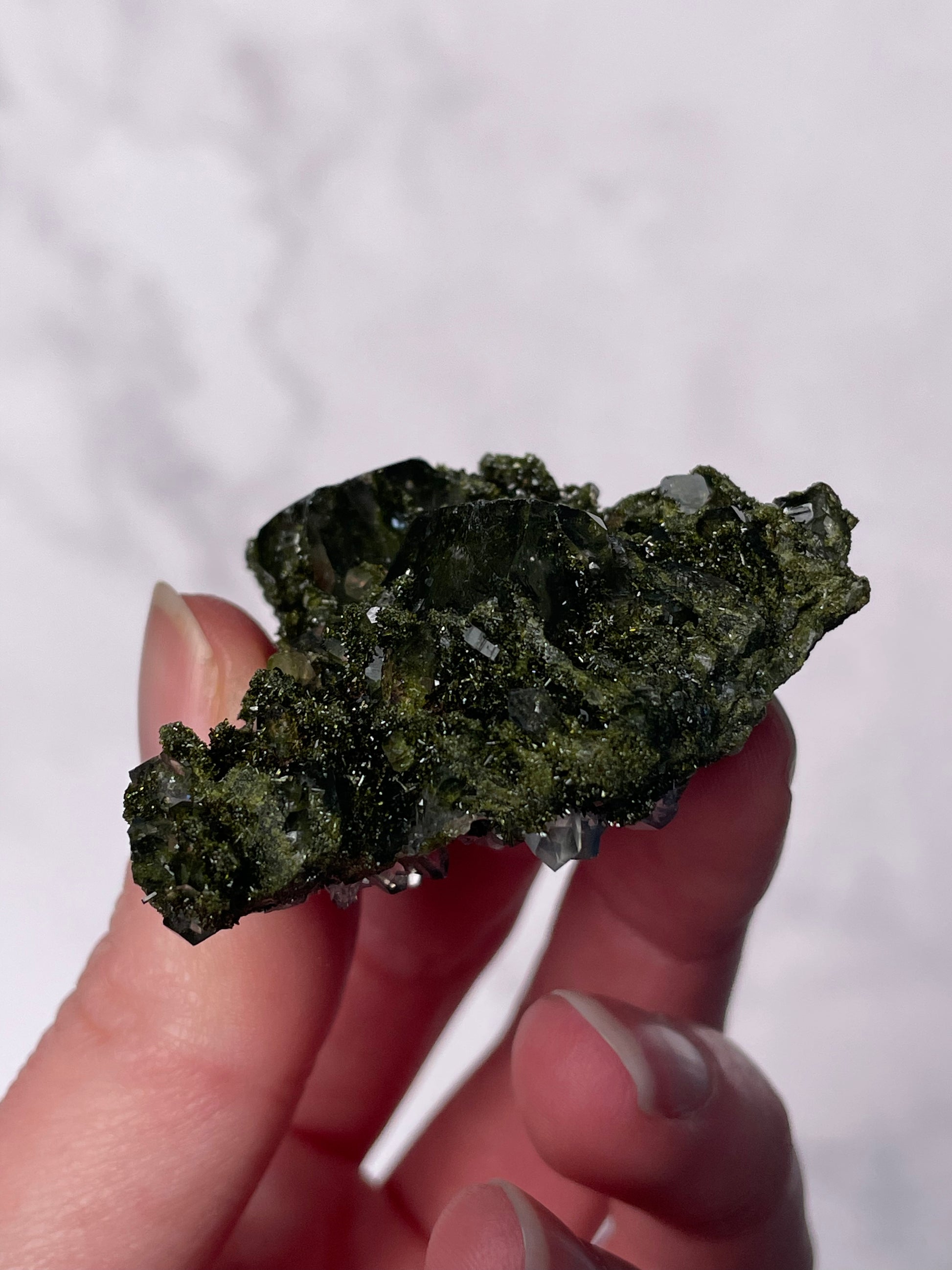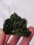 Typically dark green to blackish-green, Epidote forms in prismatic crystals or raw clusters with a vitreous luster. Some pieces display moss-like patterns and shimmering surfaces.