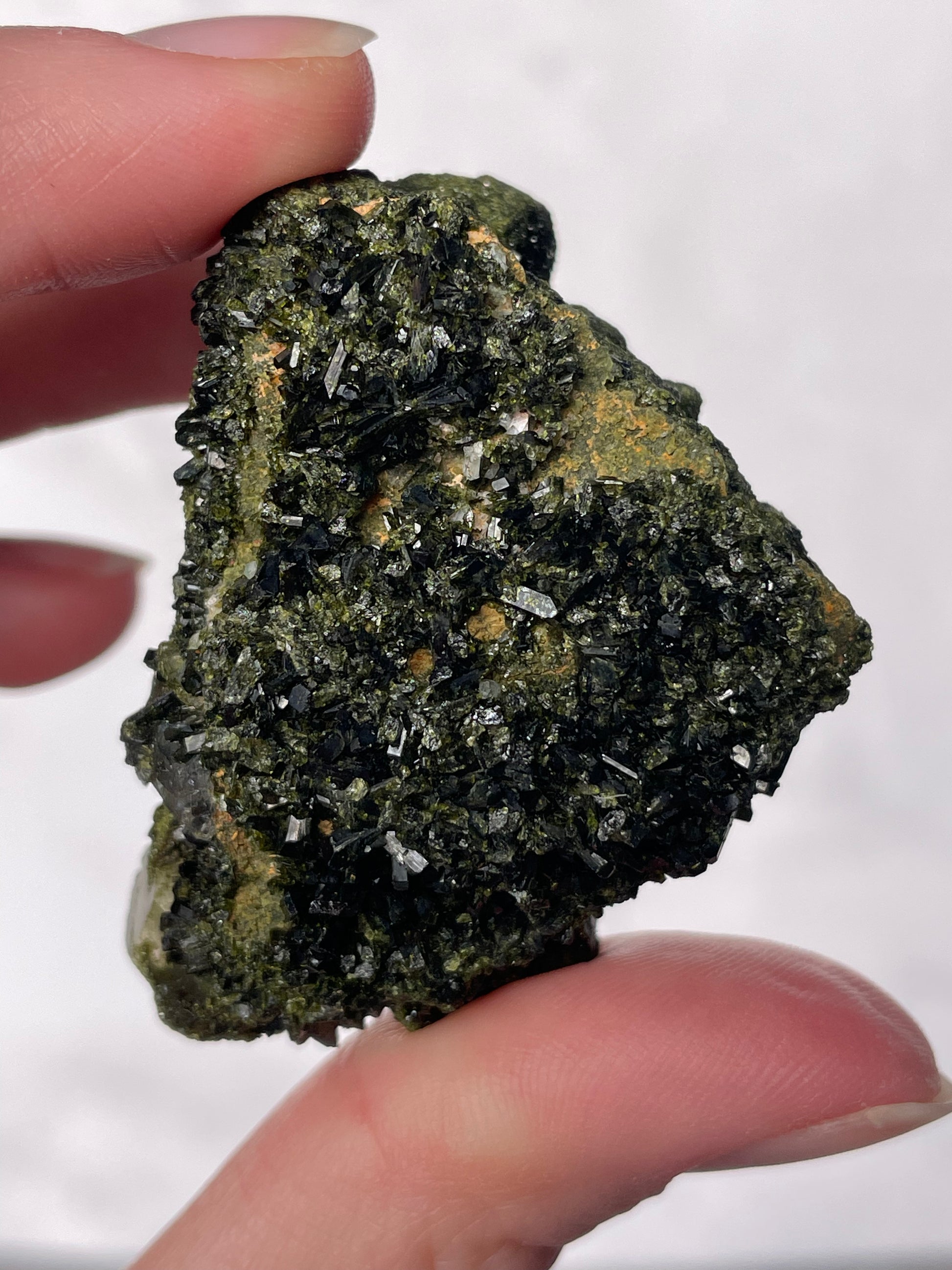 Typically dark green to blackish-green, Epidote forms in prismatic crystals or raw clusters with a vitreous luster. Some pieces display moss-like patterns and shimmering surfaces.