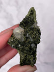 Typically dark green to blackish-green, Epidote forms in prismatic crystals or raw clusters with a vitreous luster. Some pieces display moss-like patterns and shimmering surfaces.