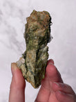 Typically dark green to blackish-green, Epidote forms in prismatic crystals or raw clusters with a vitreous luster. Some pieces display moss-like patterns and shimmering surfaces.